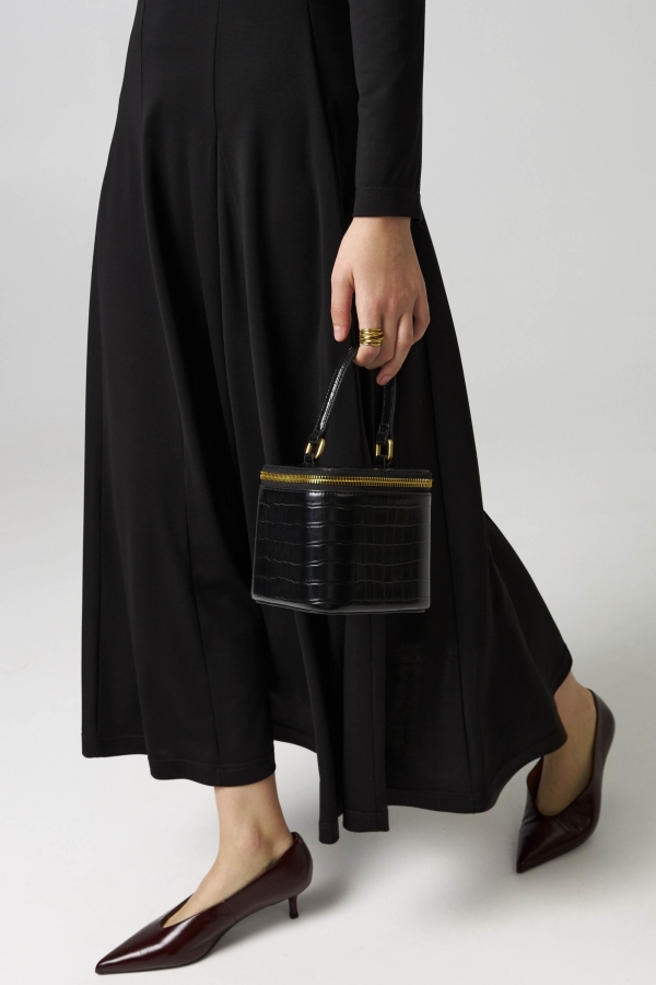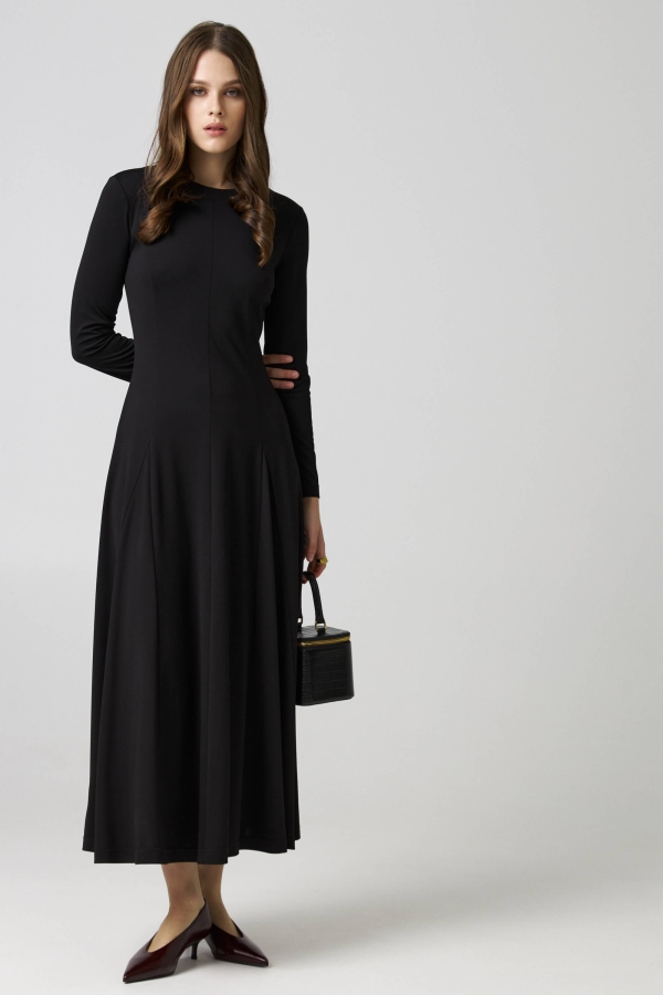 Элегантное платье из вискозного трикотажа. Модель полуприлегающего силуэта, с широкой юбкой с клиньями. Круглый вырез. Длинный втачной рукав. По переду и спинке рельефные швы. Застежка по спинке на пуговицу.