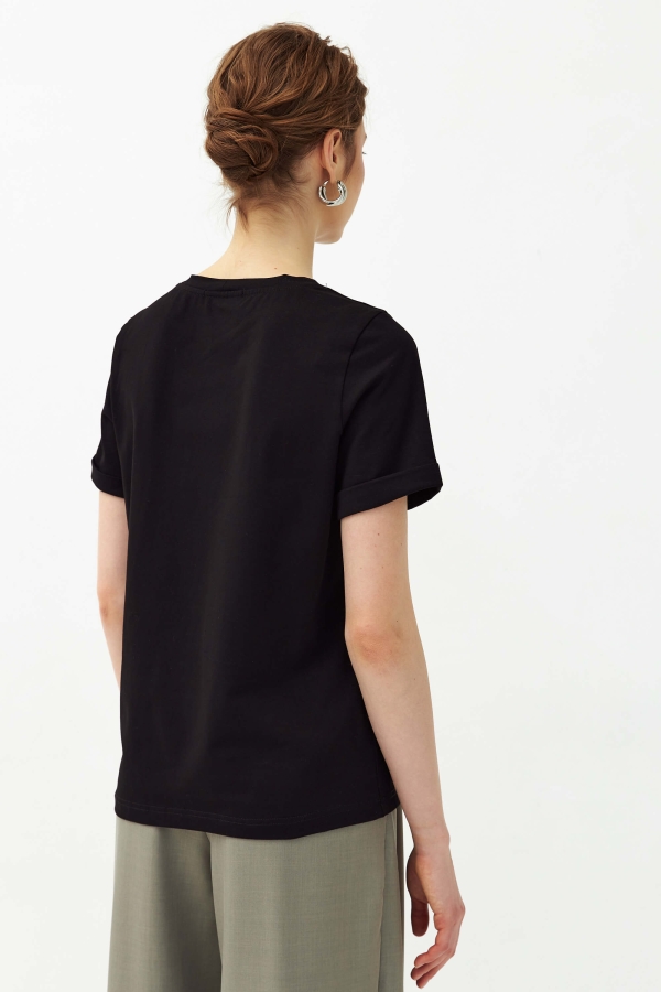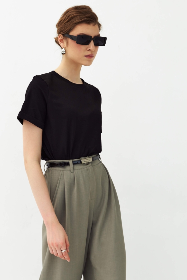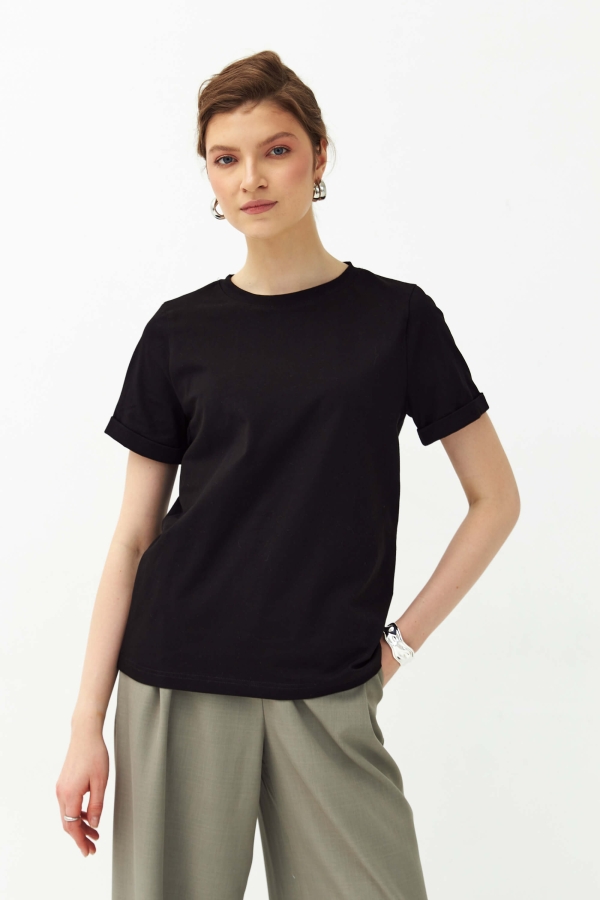 Базовая футболка из высококачественного трикотажного полотна. Модель прямого силуэта, рукав втачной. Низ ровный, без разрезов.