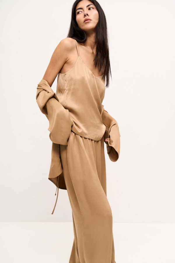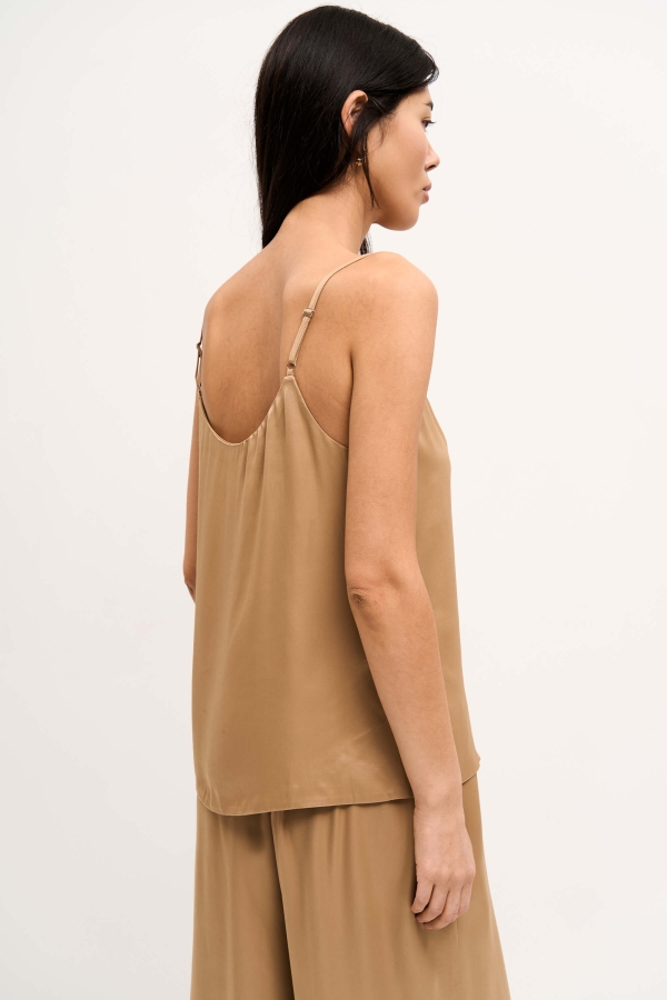 Базовый топ из вискозного атласа для любого случая. Модель полуприлегающего силуэта на тонких, регулируемых бретелях. V-образный вырез горловины по переду.