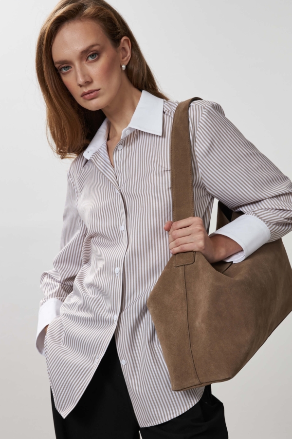 Рубашка из хлопкового полотна с контрастной отделкой. Модель свободного силуэта. Рубашечный воротник. Рукав прямой слегка спущенный, на широком манжете. Фигурная линия низа. По спинке кокетка.