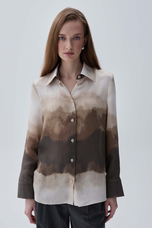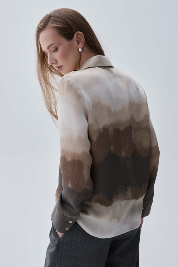 Элегантная блуза-рубашка из принтованной вискозы. Модель прямого силуэта. Воротник рубашечный. Длинный рукав на широкой манжете. Застёжка на петли и пуговицы.