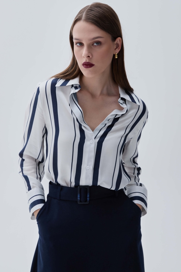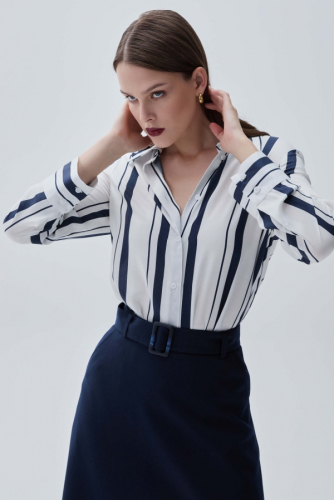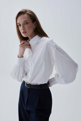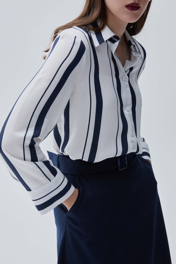 Элегантная блуза-рубашка из шелковистой вискозы. Модель прямого силуэта. Воротник рубашечный. Длинный рукав на широкой манжете. Застёжка на петли и пуговицы.