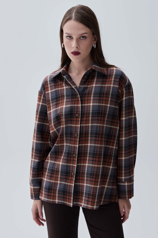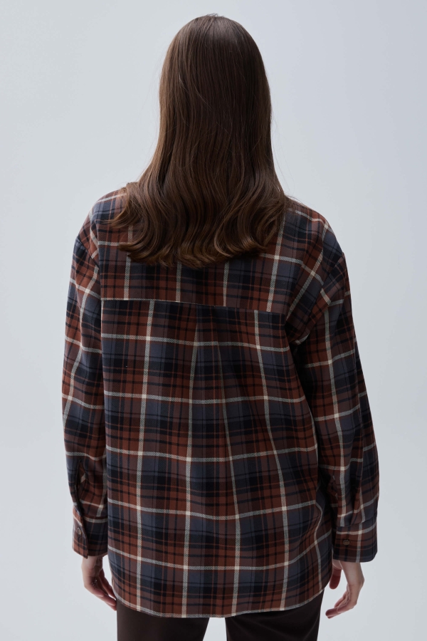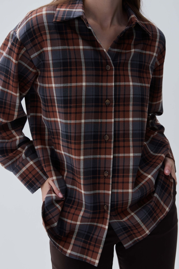 Базовая рубашка в клетку из костюмной поливискозы. Свободная рубашка со спущенным плечом и кокеткой на спинке. Воротник рубашечный на стойке, застежка на петли и пуговицу.