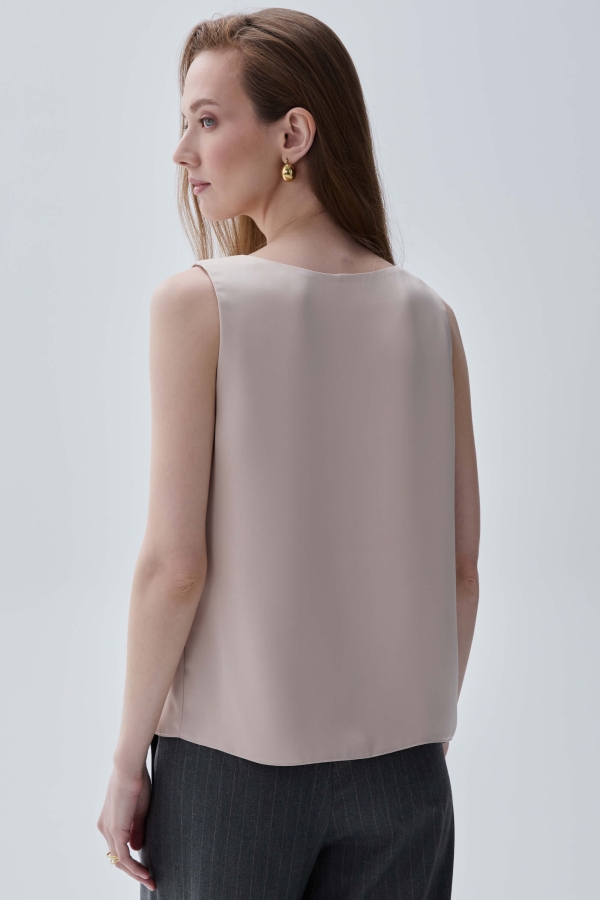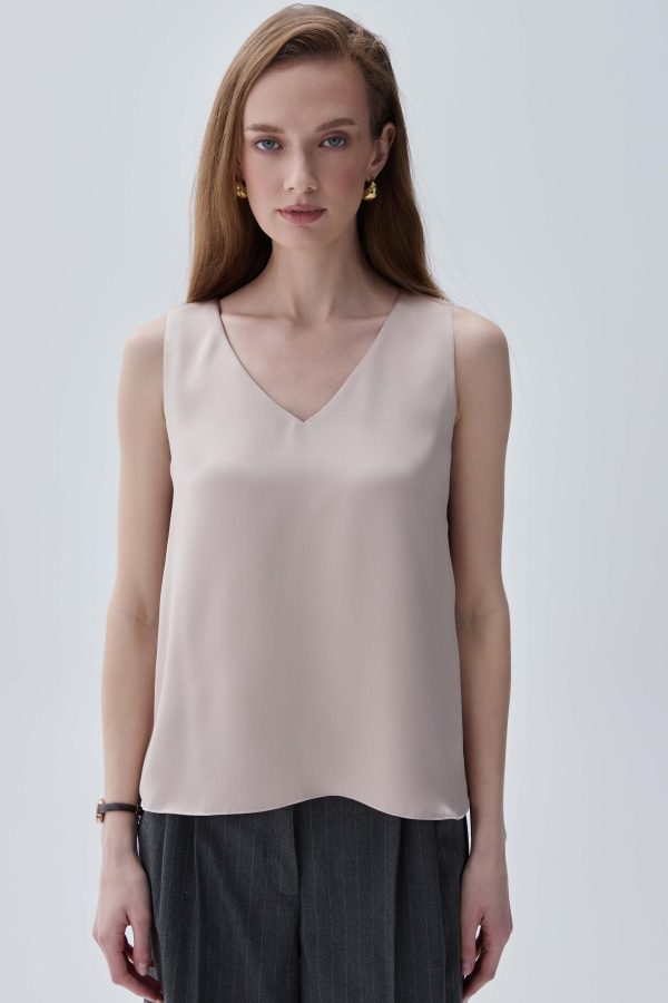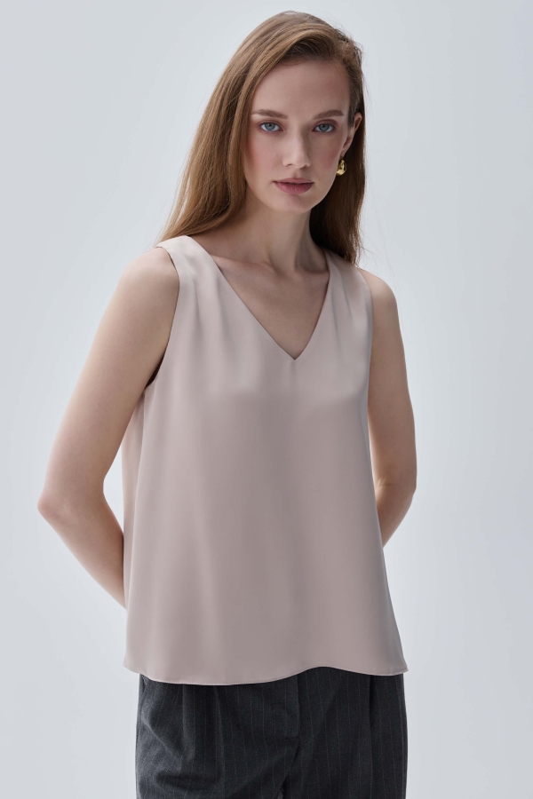 Базовый топ из атласа высокого качества. Топ свободный на широких бретелях с V-образной горловиной на обтачке.