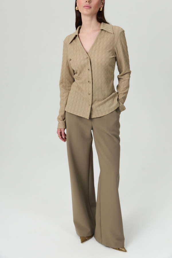 Трендовая блуза из фактурного трикотажного полотна. Модель полуприлегающего силуэта. V-образный вырез с отложным воротником. Втачной рукав. Застежка по переду на пуговицы.