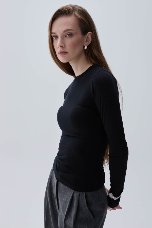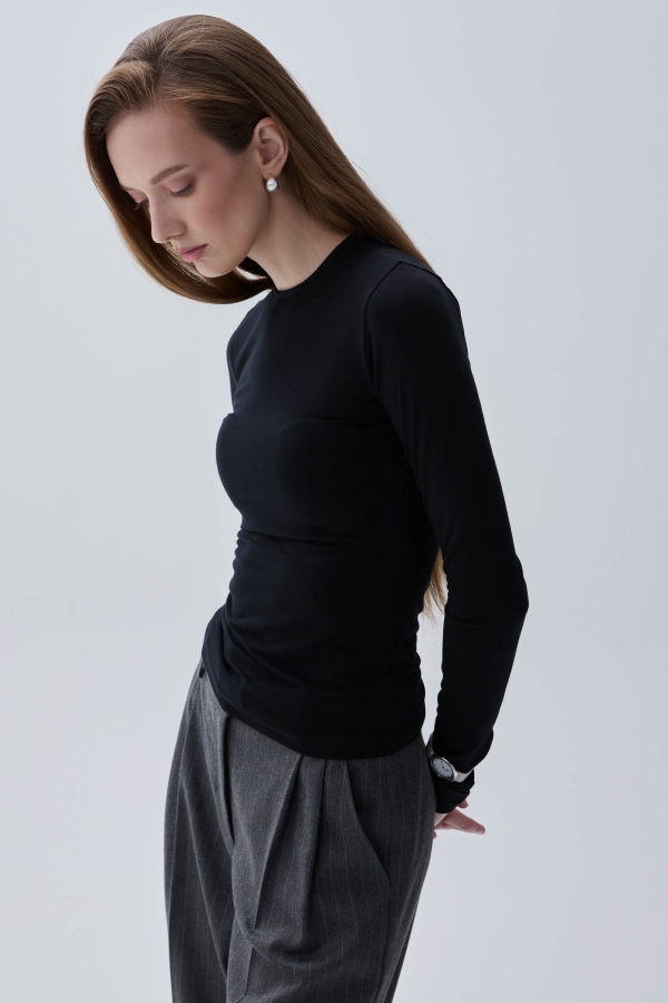 Базовый лонгслив из мягкого вискозного трикотажа. Модель прилегающая с втачным рукавом, круглая горловина.