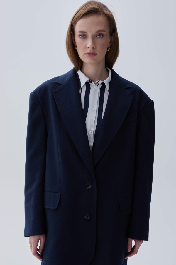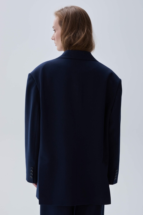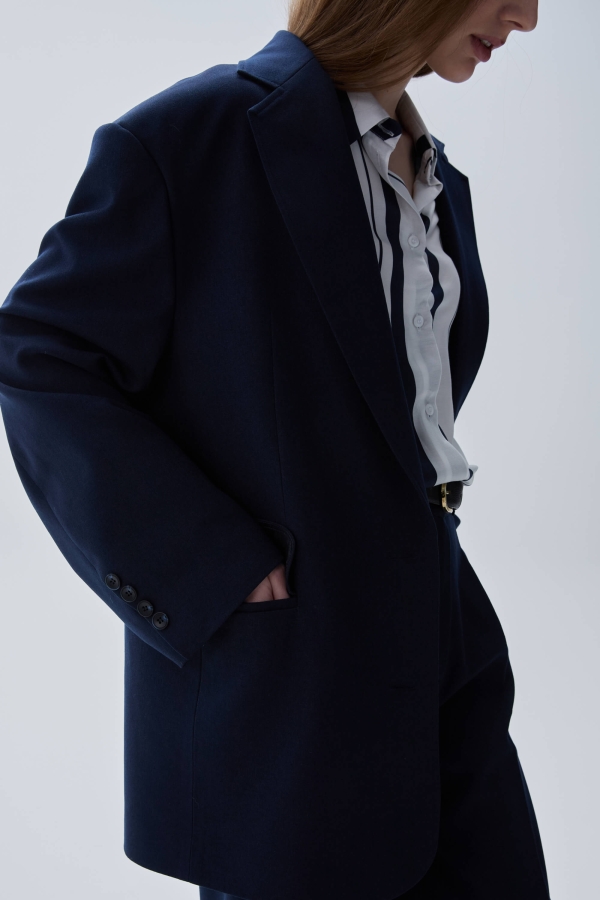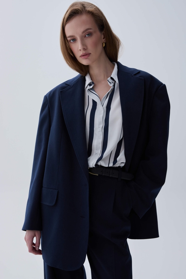 Трендовый жакет свободного кроя. Жакет oversize со спущенной и расширенной линией плеча. На полочке прорезные карманы с клапанами, по спинке две шлицы по бокам. Застежка на пуговицы и петли.