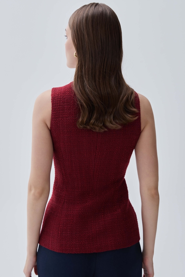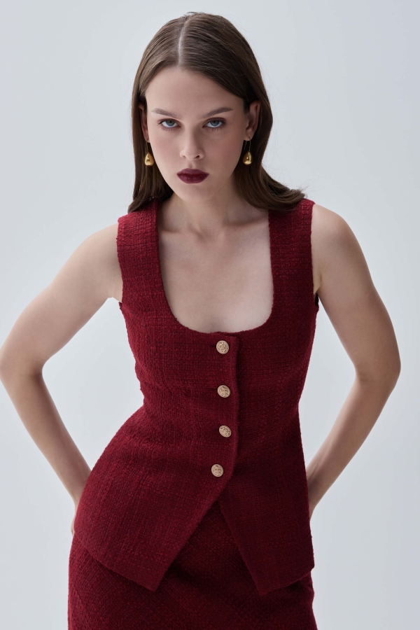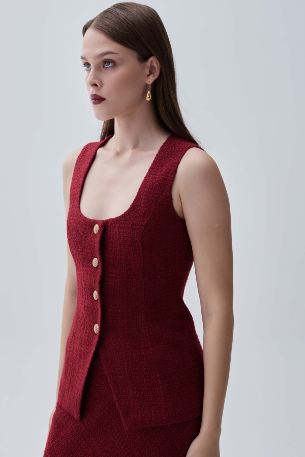 Элегантный жилет из твидового полотна в трендовом оттенке. Прилегающий жилет с квадратный вырезом по горловине, застежка на петли и акцентные пуговицы. Изделие на подкладке из поливискозы.