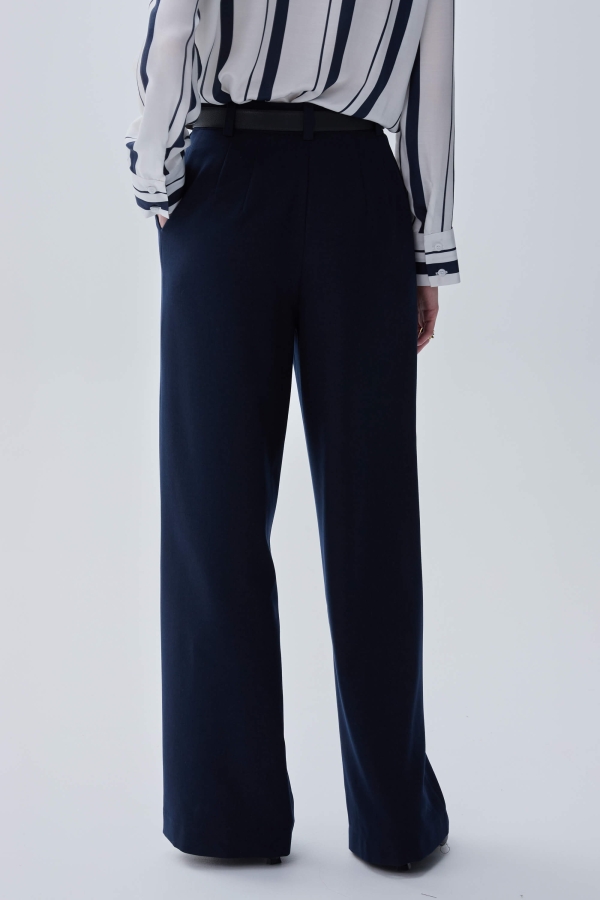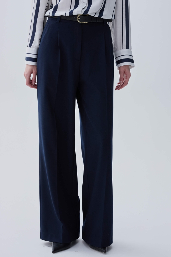 Комфортные брюки из костюмной поливискозы. Прямые свободные брюки с высокой посадкой и стрелками. Боковые карманы, застежка-гульфик на молнию и пуговицу.