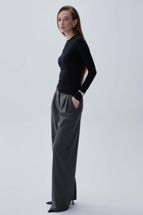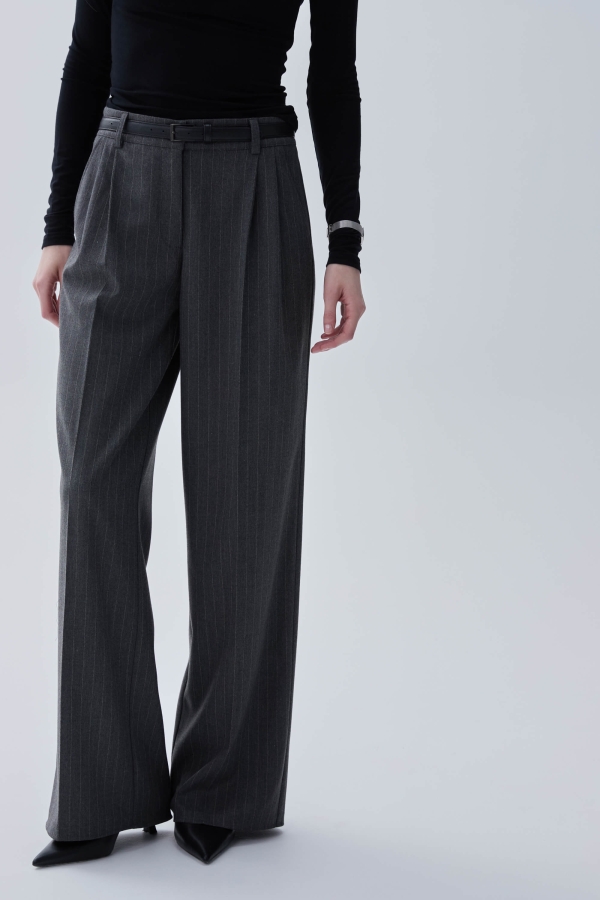 Брюки из костюмного полотна в полоску. Свободные брюки на средней посадке со складками. Боковые карманы и застежка на молнию и пуговицу.