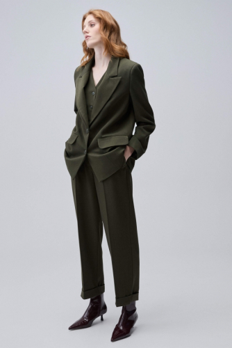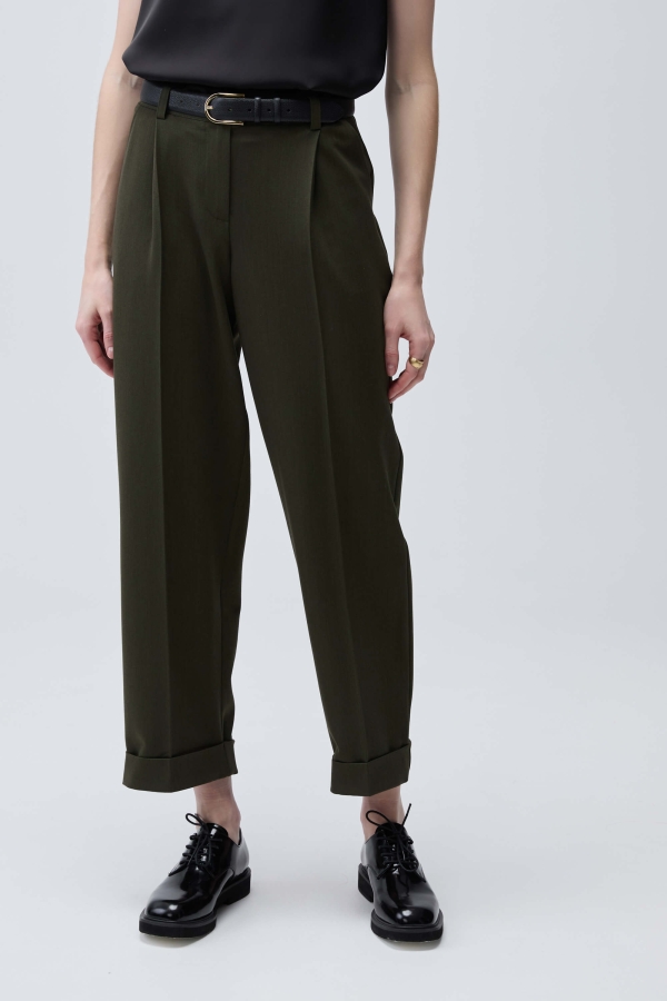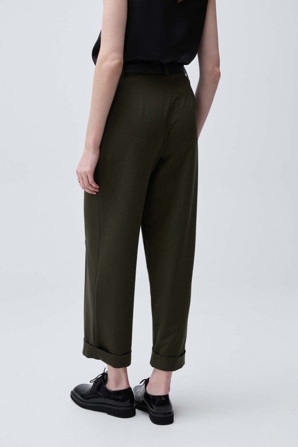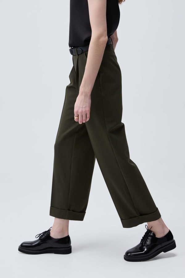 Укороченные брюки с манжетами. Модель свободного силуэта, зауженная к низу со стрелками. Пояс притачной со шлевками,посадка средняя. По переду карманы. Застежка гульфик на хлястик с пуговицей. По низу манжеты.