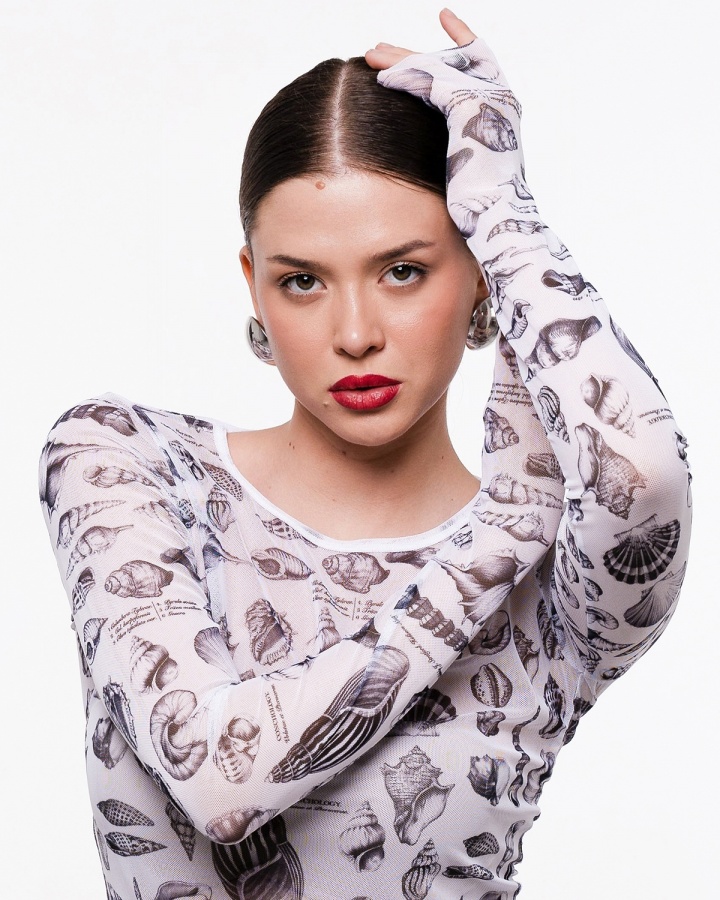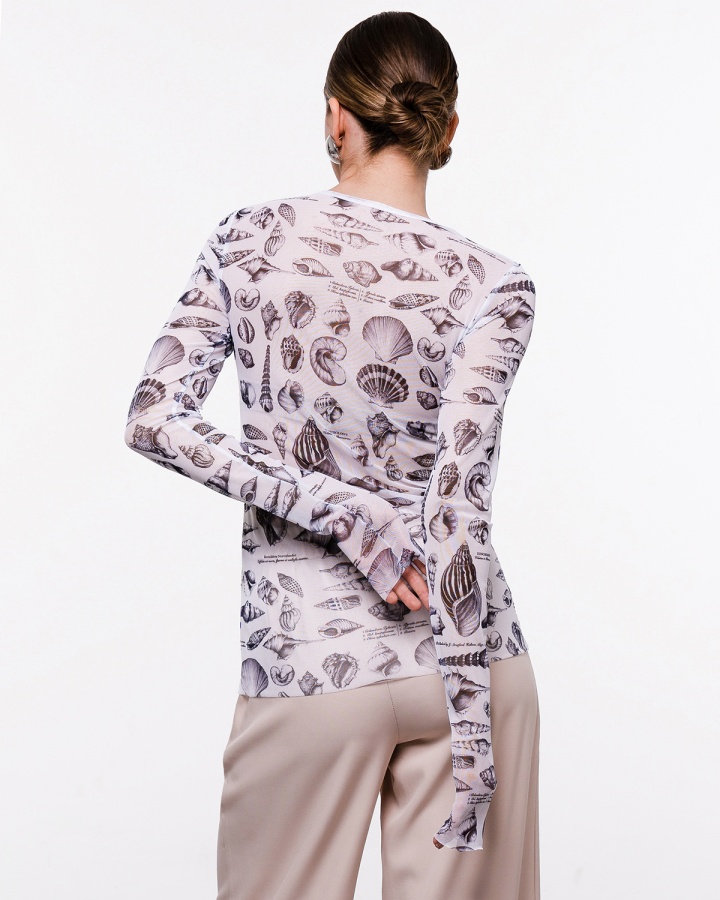 Лонгслив женский из сетки с принтом-тренд Весна-Лето 2024.  Его можно надевать под платье, жакет, кардиган, жилет или даже футболку.