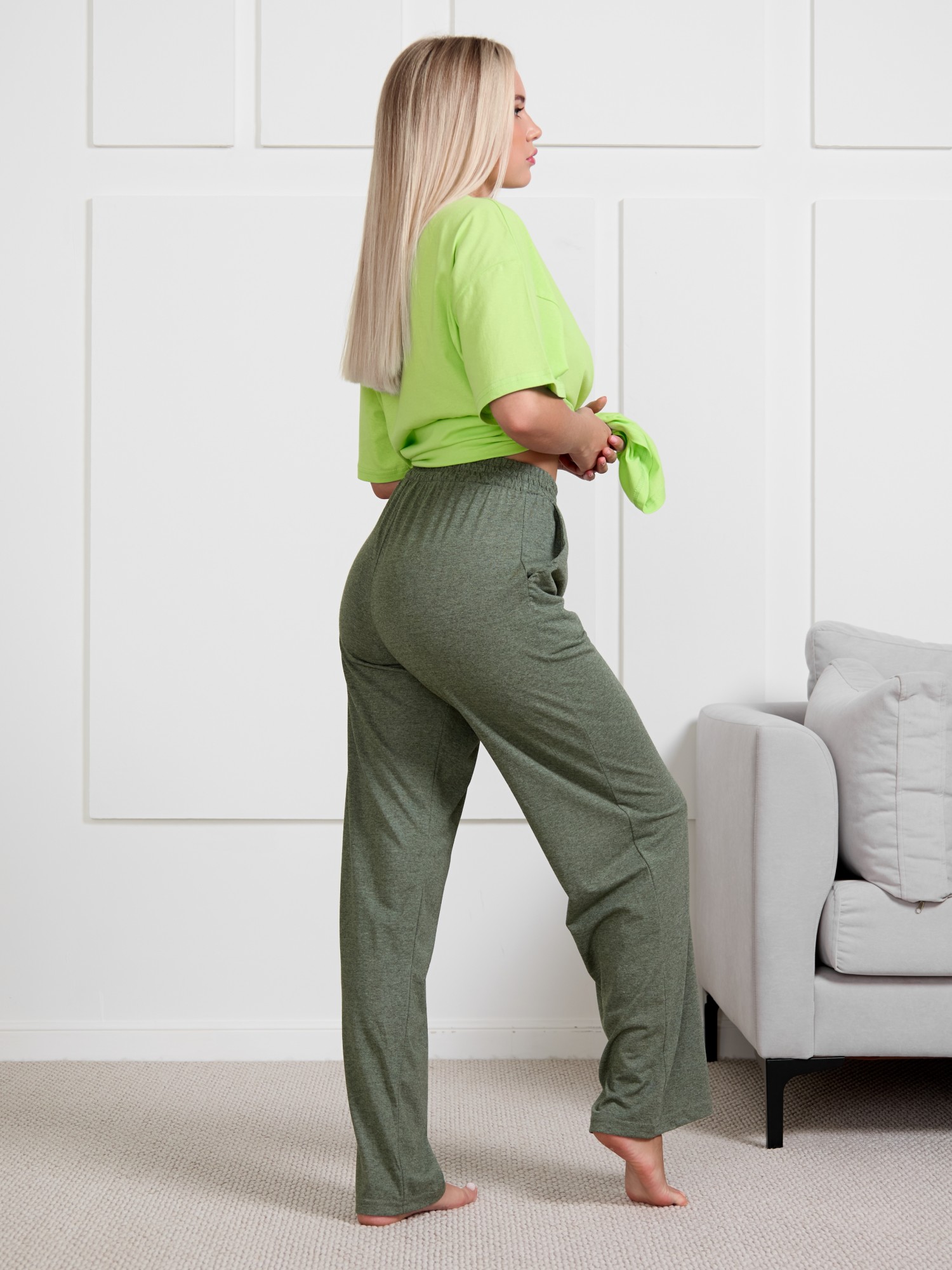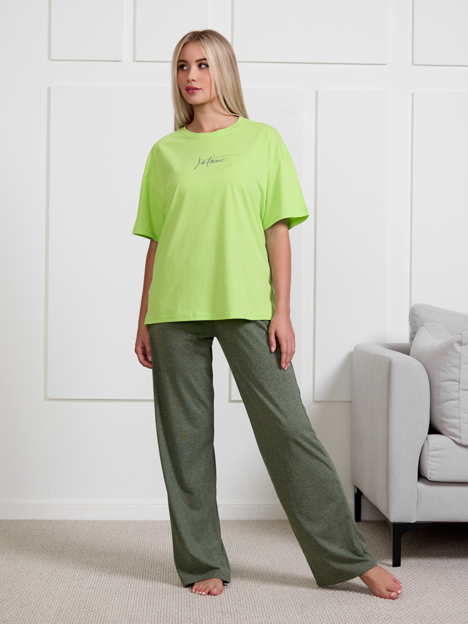 Костюм женский из трикотажного полотна в комбинации двух видов тканей: «кулирка» и «меланжированная кулирка» состоящий из футболки и брюк. Футболка - из гладкокрашенного полотна «кулирка», классического покроя, с короткими втачными рукавами, горловиной овальной формы и принтом на полочке, выполненным в технике «шелкографии». Горловина обработана притачной бейкой из основного материала.Брюки – из гладкокрашенного полотна «кулирка/меланж» контрастного цвета, длинные, классического кроя, с карманами в боковых швах, на притачном поясе с эластичной тесьмой внутри.