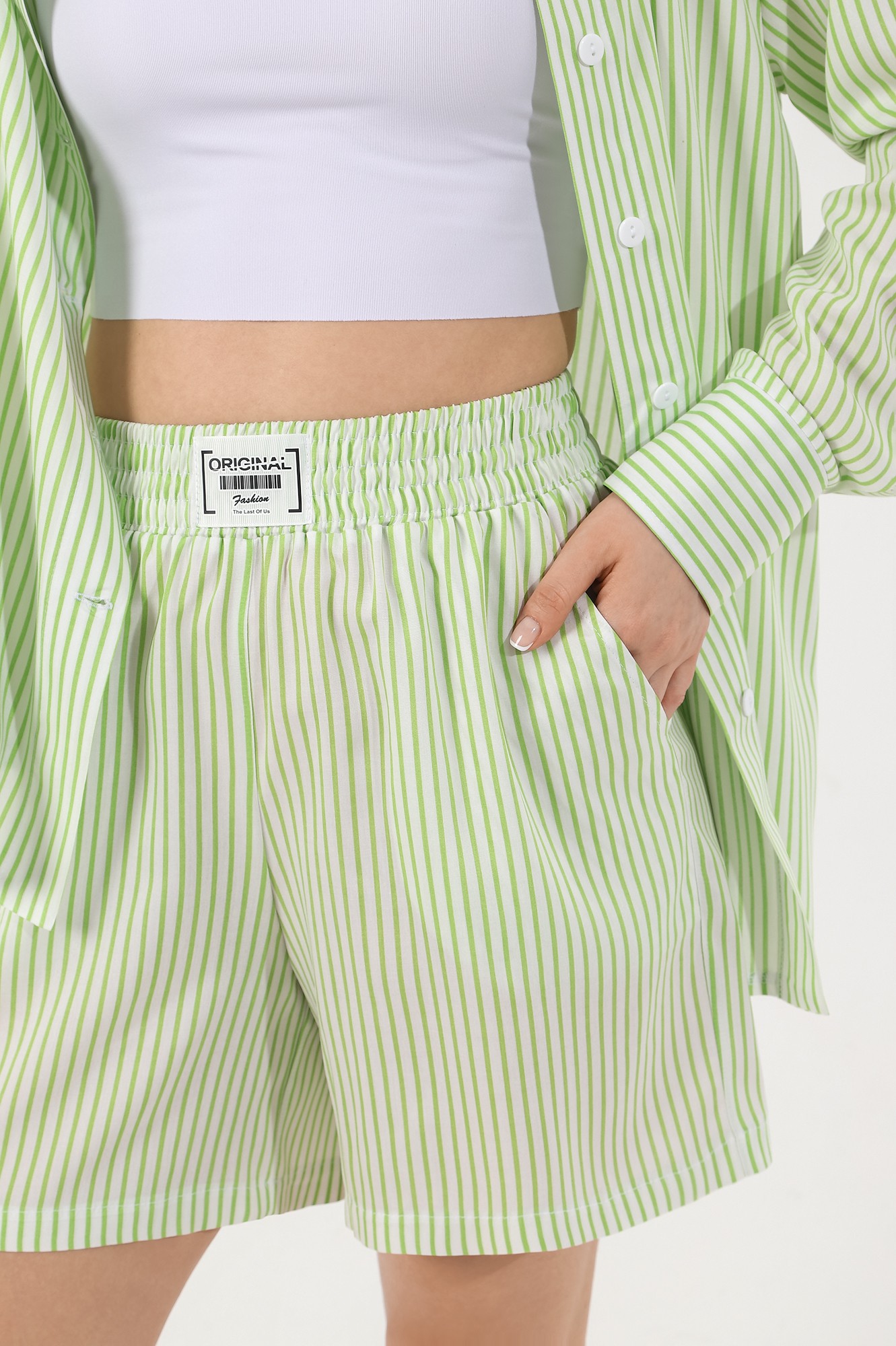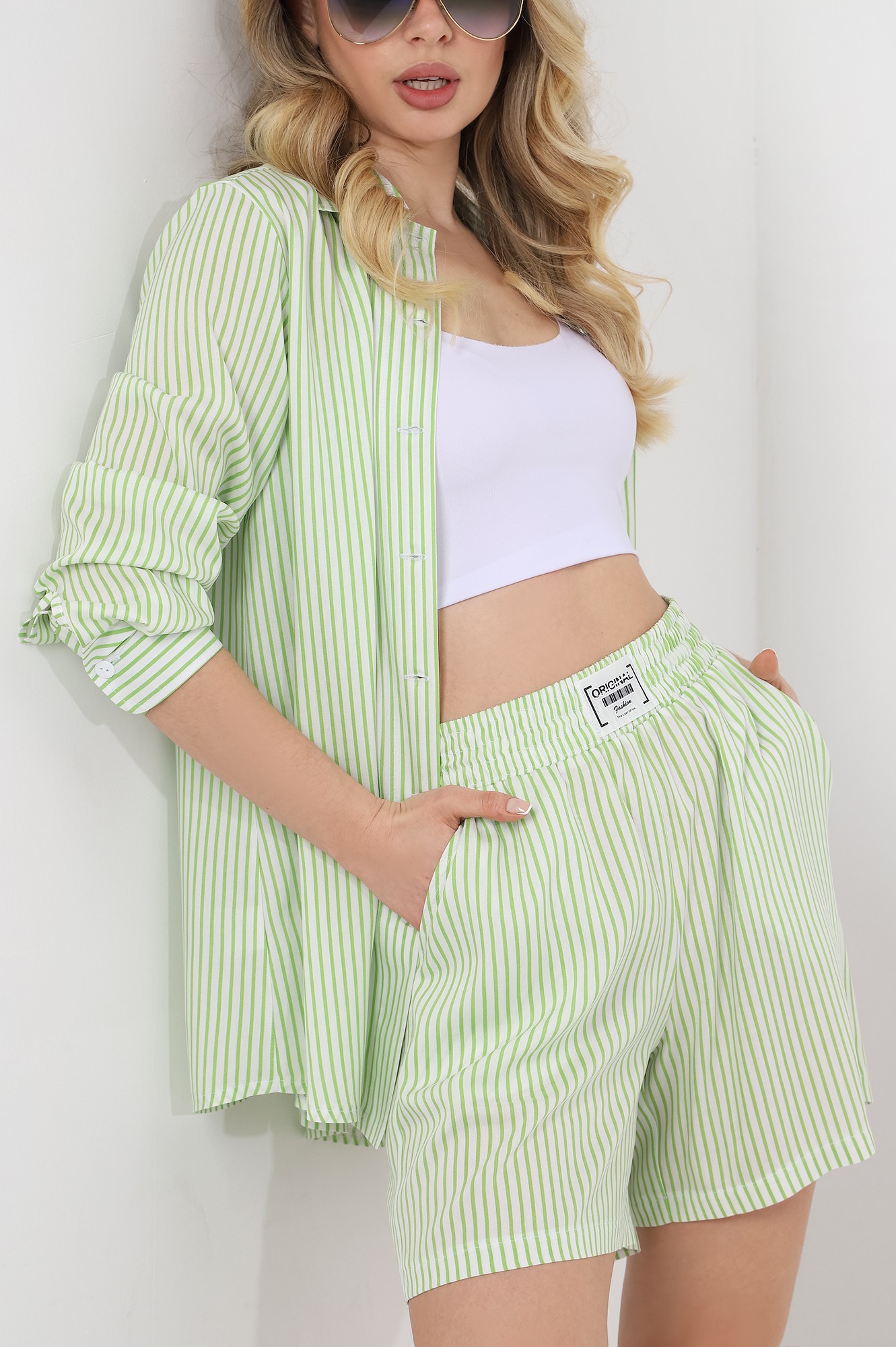 Костюм молодежный из штапельного полотна с набивным рисунком «полоска», состоящий из блузки-рубашки и шорт.Блузка-рубашка свободного кроя, со стояче-отложным воротником, спущенным длинным рукавом. Перед из двух частей с центральной бортовой застежкой на петли и пуговицы, спинка цельнокроеная. Низ рукава с притачной манжетой, застегивающейся на петлю и пуговицу.Шорты свободные, средней длины, на притачном поясе с эластичной тесьмой внутри, карманами в боковых швах.