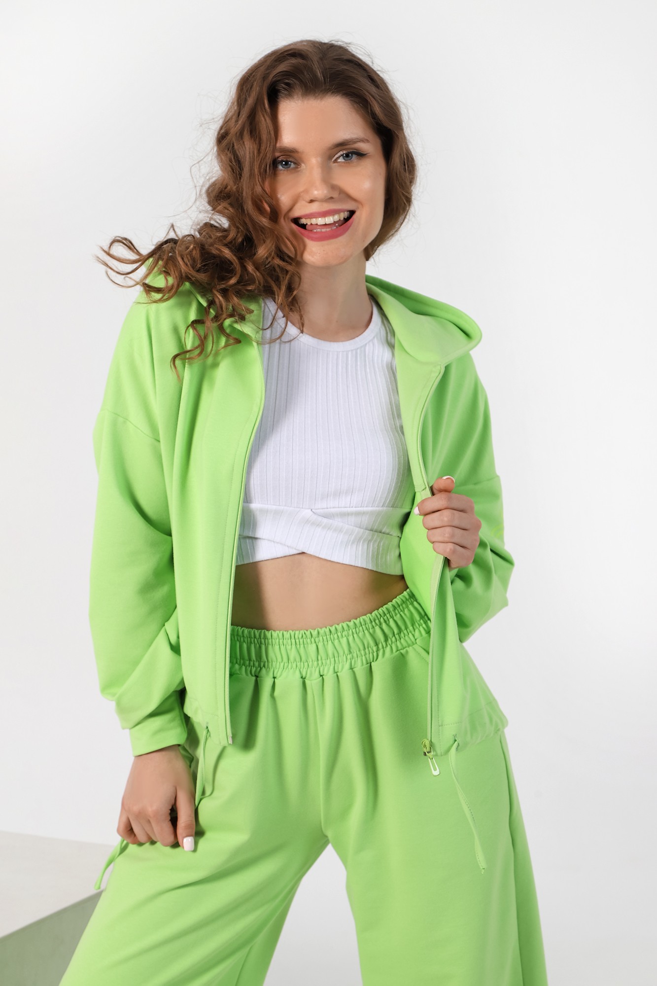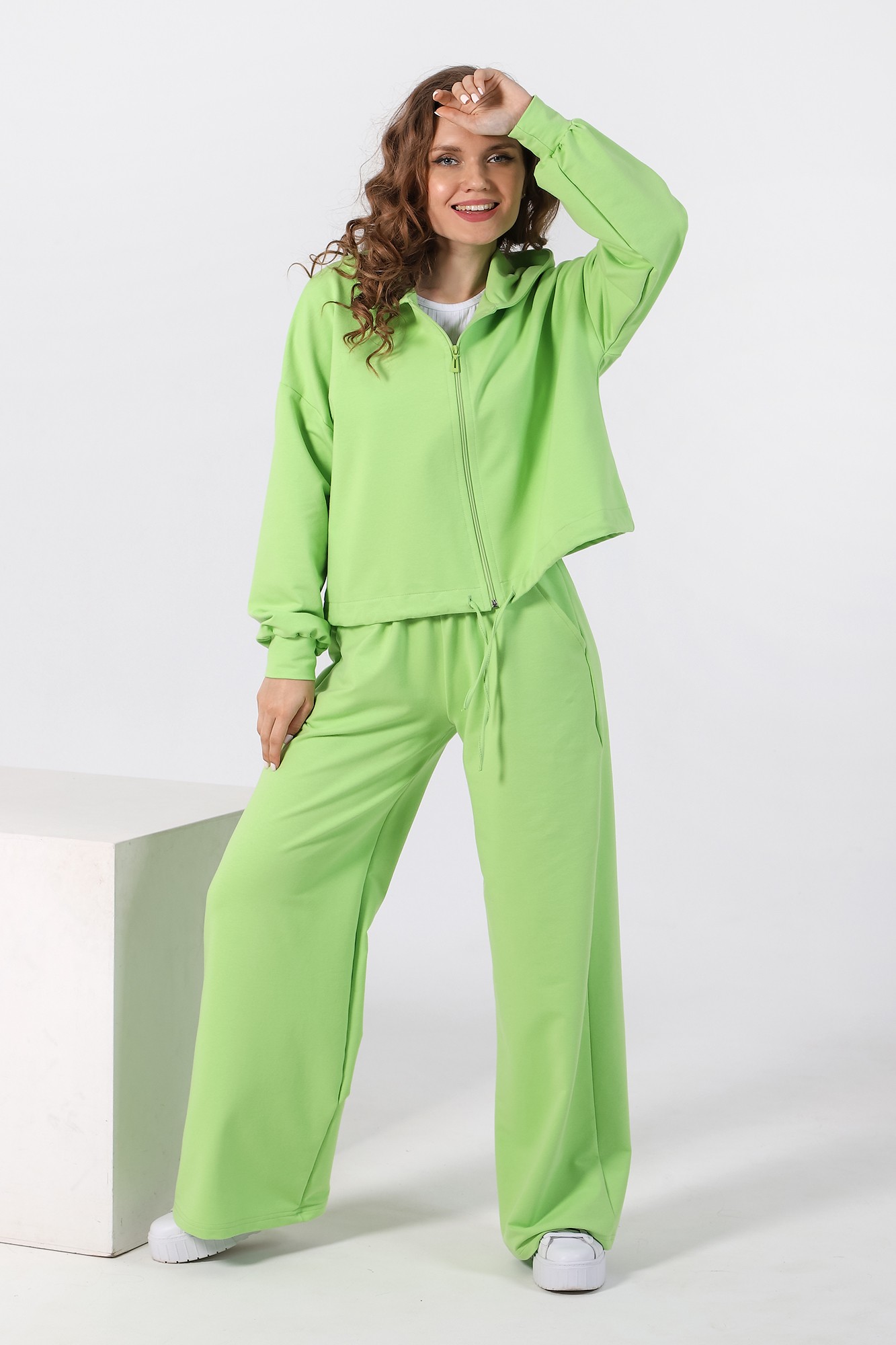 Костюм молодежный из гладкокрашенного трикотажного полотна «футер двунитка», состоящий из кофты и брюк. Куртка - свободного силуэта, с длинными втачными рукавами, с притачными манжетами, капюшоном и центральной бортовой застежкой на тесьму «молния». На рукавах по шву притачивания манжет выполнена сборка, низ изделия обработан в подгибку с вложением шнура, продернутым через две обметанные петли, на полочке принт, выполненный в технике «шелкографии». Брюки – свободного покроя расширенные книзу, на притачном поясе с эластичной тесьмой внутри и карманами в боковых швах.