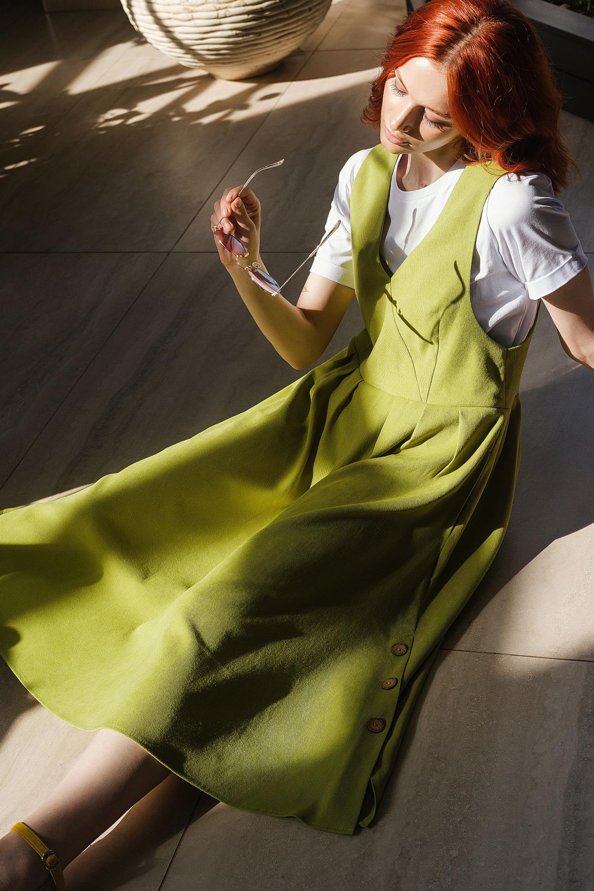 Описание: Сарафан в бохо-стиле с широкой юбкой. Глубокие складки по талии не добавляют объем. Глубокая горловина с декоративным запахом зрительно вытягивает силуэт. Декоративные пуговицы по шлицам в боковых швах подчеркивают стилистику изделия.