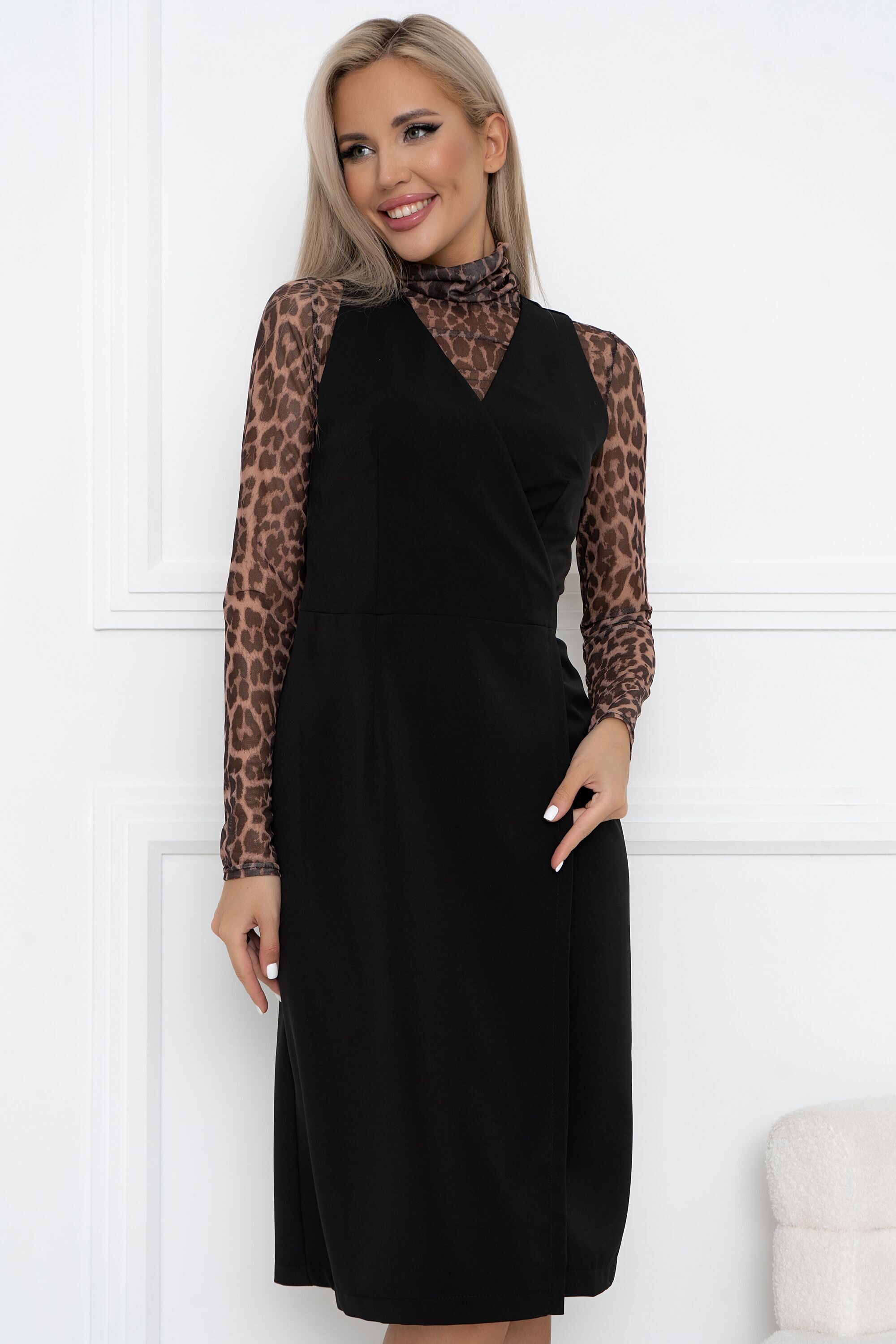 Черный сарафан с запахом отлично подойдет для осени благодаря своей универсальности.