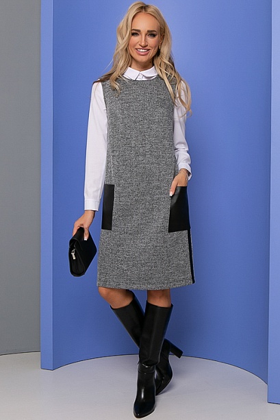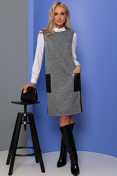 Сарафан свободного силуэта из плотного трикотажного полотна в елочку с контрастной отделкой из экокожи.