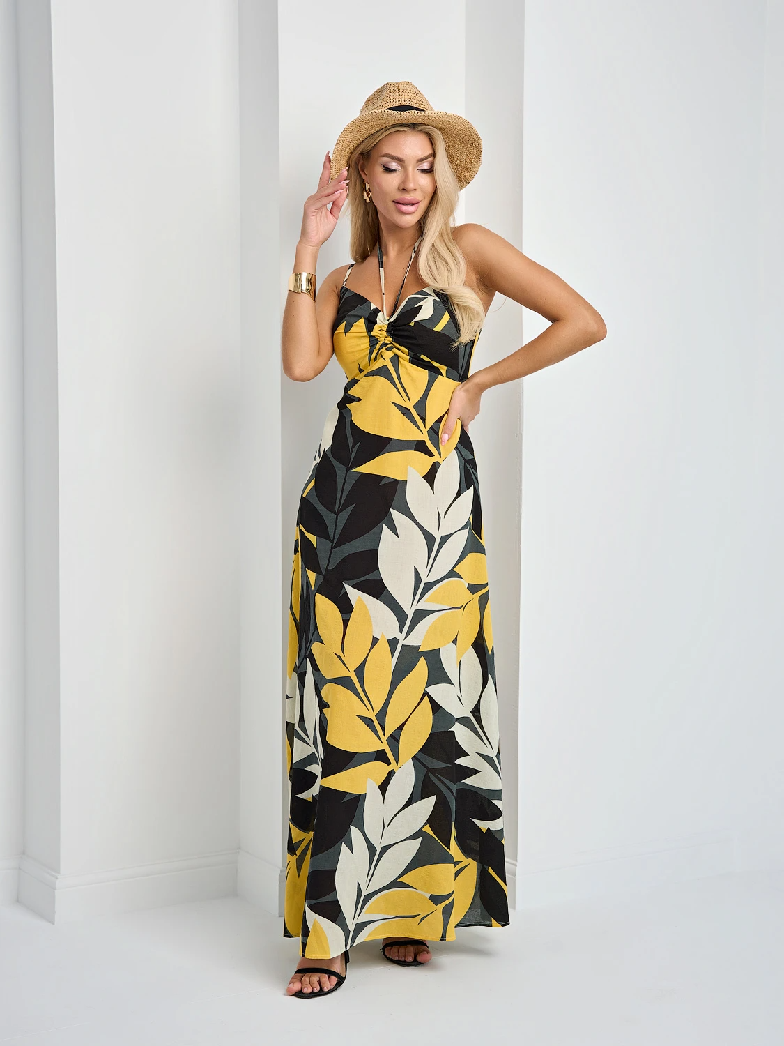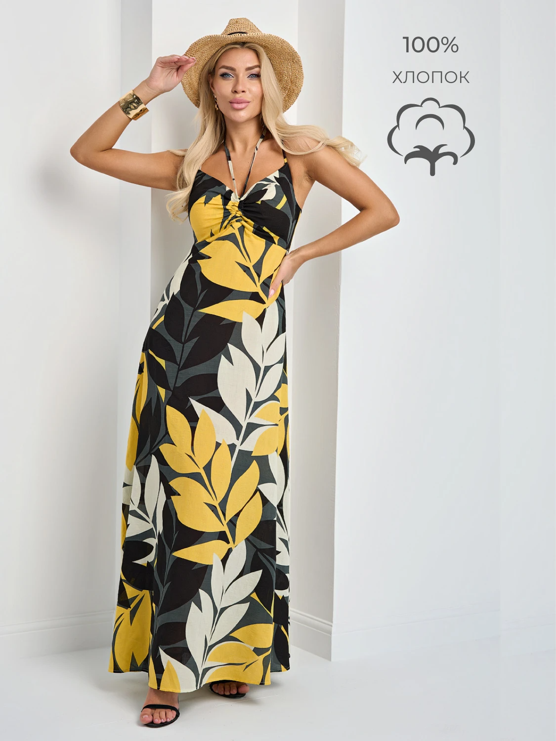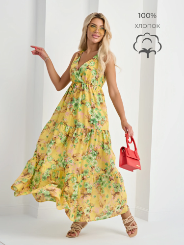 Летний сарафан длины макси на тонких бретелях , выполненных из основной ткани.