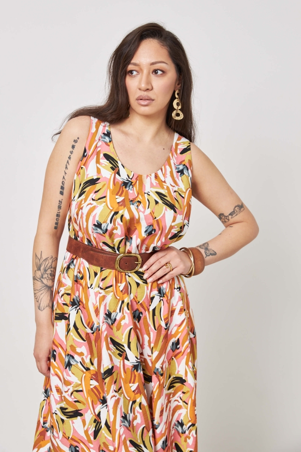 Свободный сарафан макси трапециевидного силуэта с цельнокроеными бретелями.