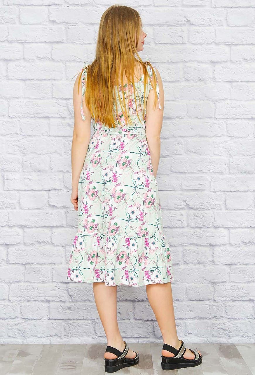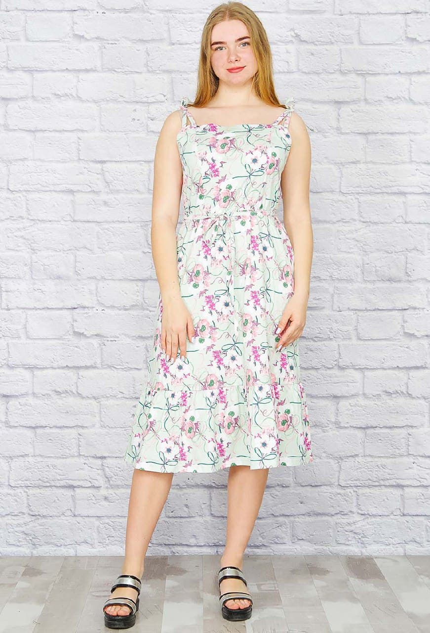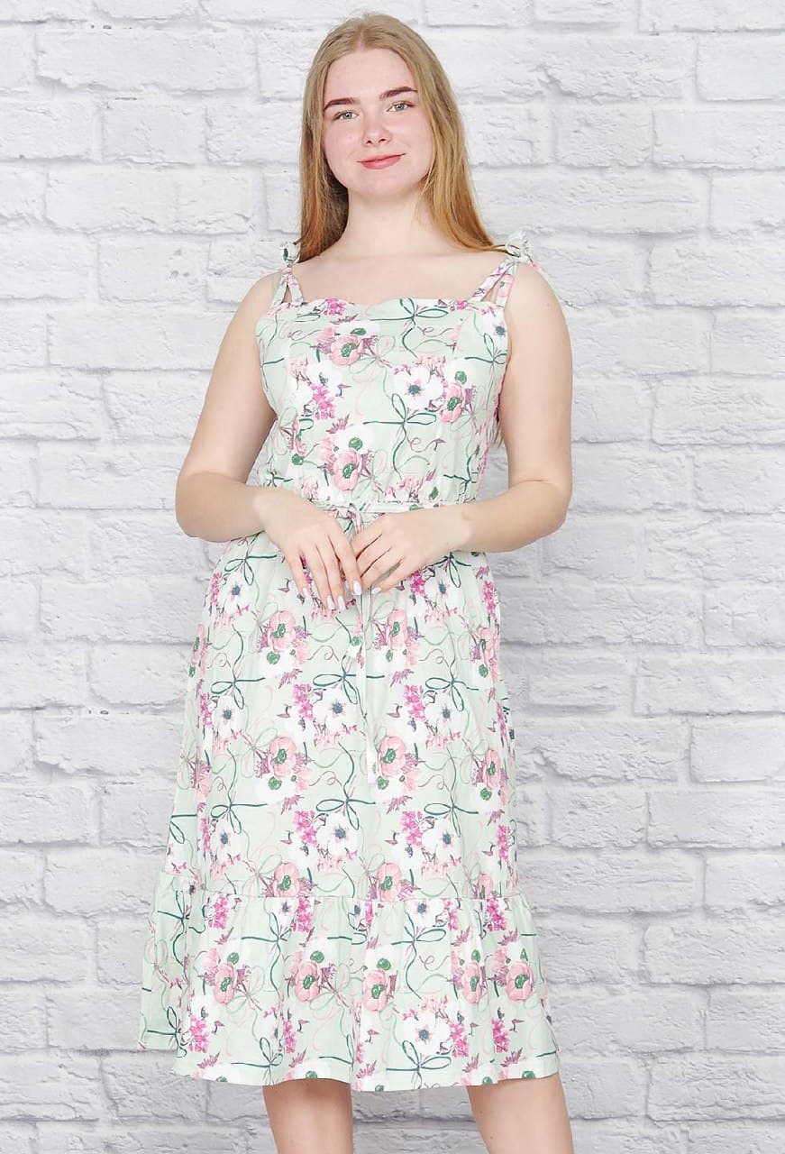 Хлопковый летний сарафан на тонких бретелях. Лиф с глубокими рельефными вытачками. Линия талии на резинке, сверху тонкий поясок. По низу изделия пышная оборка-волан.