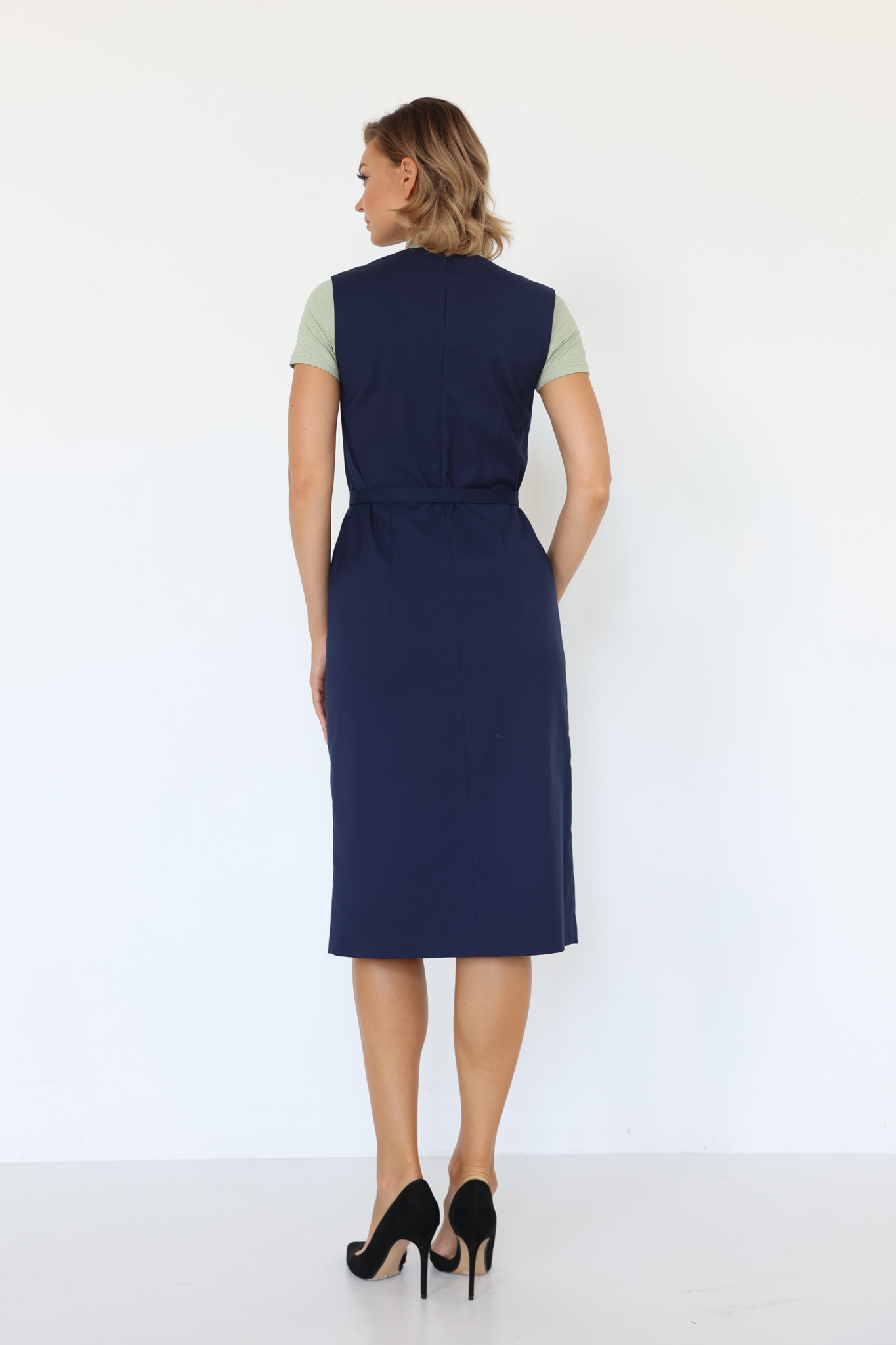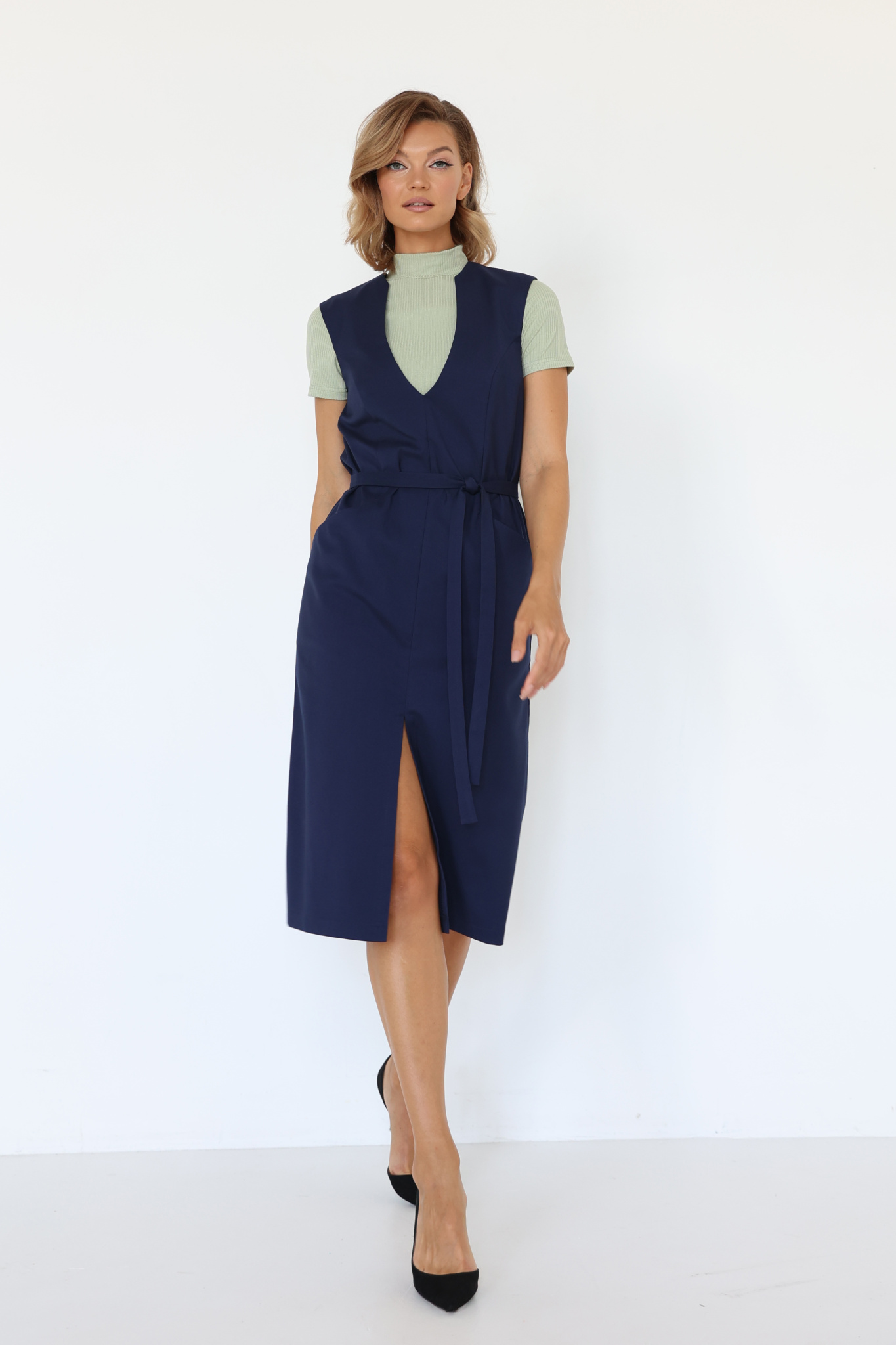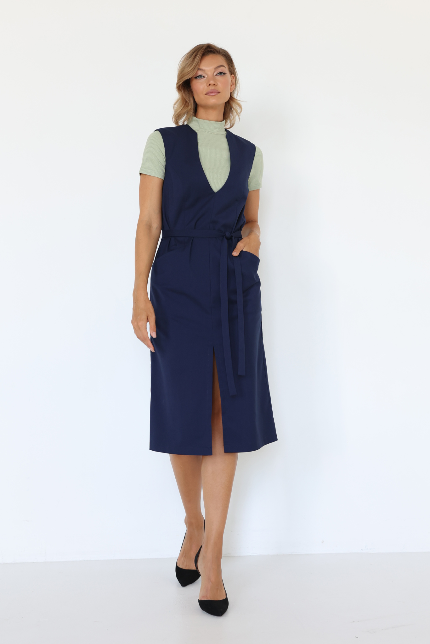 Сарафан строгого кроя с V-образным вырезом и разрезом. Накладные карманы, пояс в комплекте.