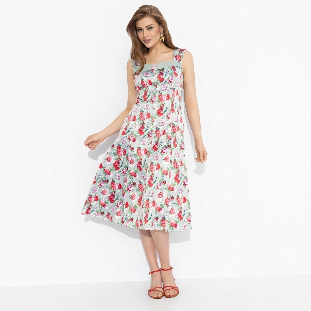 Проснуться от пения птиц, легкого ветерка из открытого окна и аромата свежеприготовленных пончиков. Атмосфера загородного дома пленит тебя с детства. Платье с цветочным узором ЧАРУТТИ поможет окунуться в любимый флер роскошных образов для легких прогулок. Приталенный силуэт, длина миди. Отвороты в зоне декольте. Широкие бретели в тон основного материала изделия. Есть карманы. Платье украшено пуговицами. Застегивается на скрытую молнию.