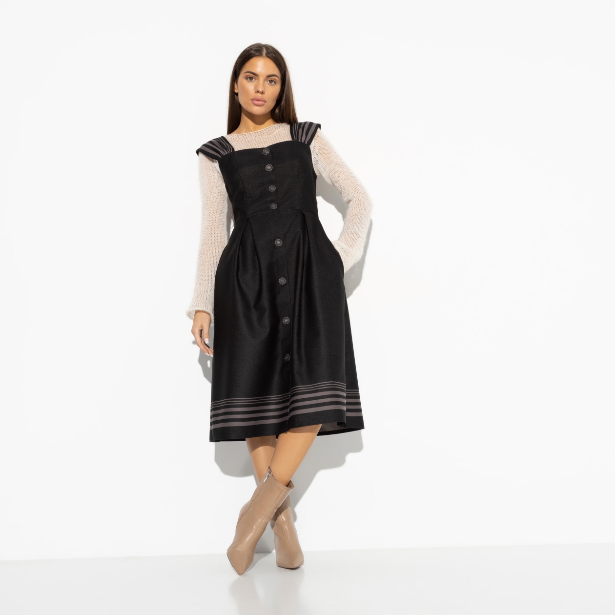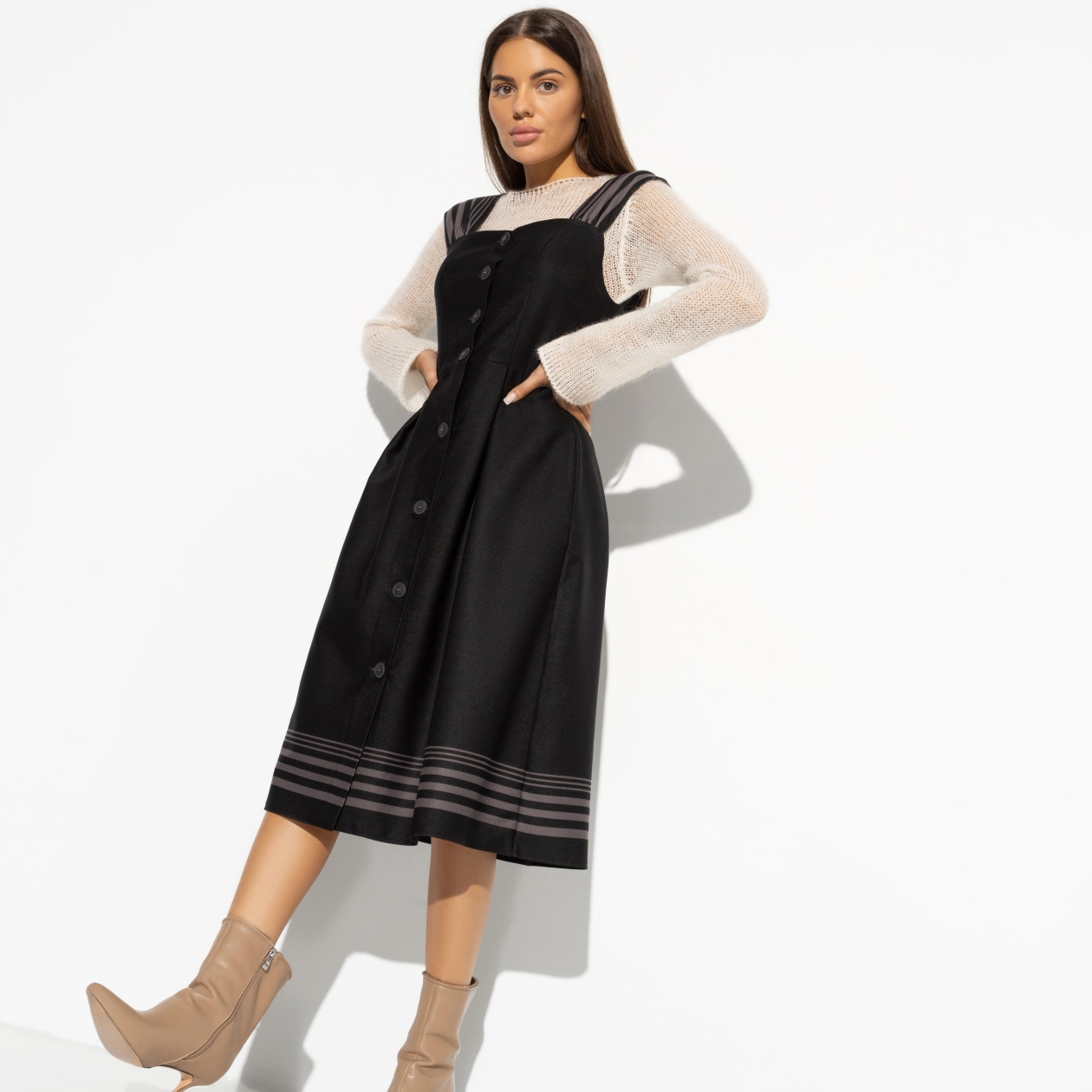 Он часто называл тебя принцессой, в конце концов, ты ею и стала. Сдержанность, элегантность и высокое внутреннее достоинство воплотились в сарафане CHARUTTI. Сарафан в длине миди. Приталенный силуэт, расклешенный фасон юбки. Широкие бретели. Сарафан застегивается на пуговицы по всей длине изделия.
