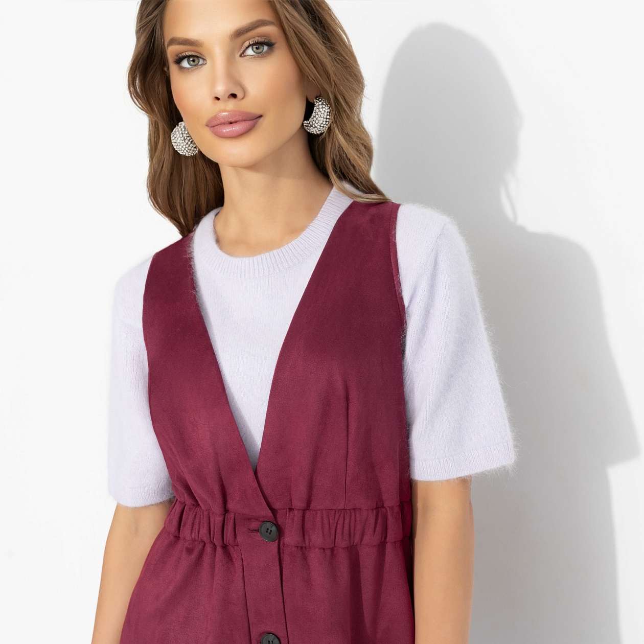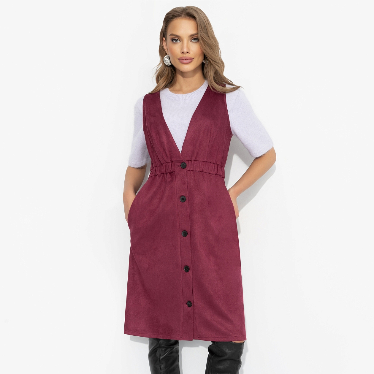Каждая встреча с тобой ‒ как глава яркого романа. Одновременно сильная и женственная, ты появляется в сарафане ЧАРУТТИ цвета бургунди. Уверенный взгляд, загадочная улыбка и стук каблуков... Сарафан из замши, с высокой талией, функциональными карманами и пуговицами по всей длине. Богатый винный оттенок для покорительниц жизни, которые проживают свою историю ярко и не боятся быть на главных ролях.