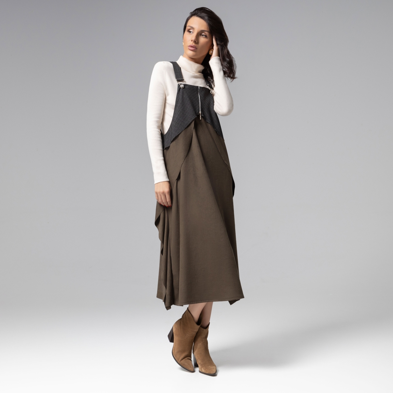 Сарафан-миди в оттенках хаки: авангардная элегантность. Свободный новаторский крой, сочетающий трендовую экозамшу и костюмную ткань премиального качества, создаёт архитектурный силуэт со шлейфом восточной философии. Воздушные рюши по бокам подчёркивают игру света на сложной поверхности ткани. Сарафан ЧАРУТТИ представляет собой манифест роскошного casual, где комфортный крой встречается с нетривиальным дизайном.