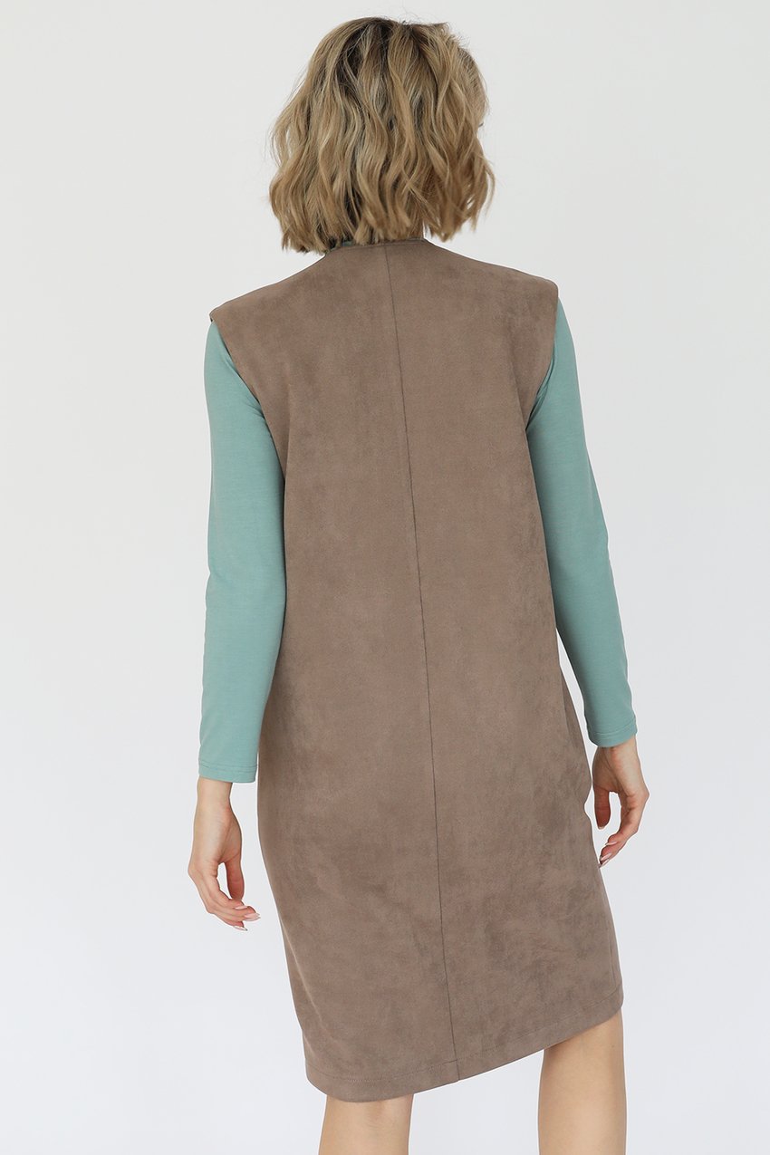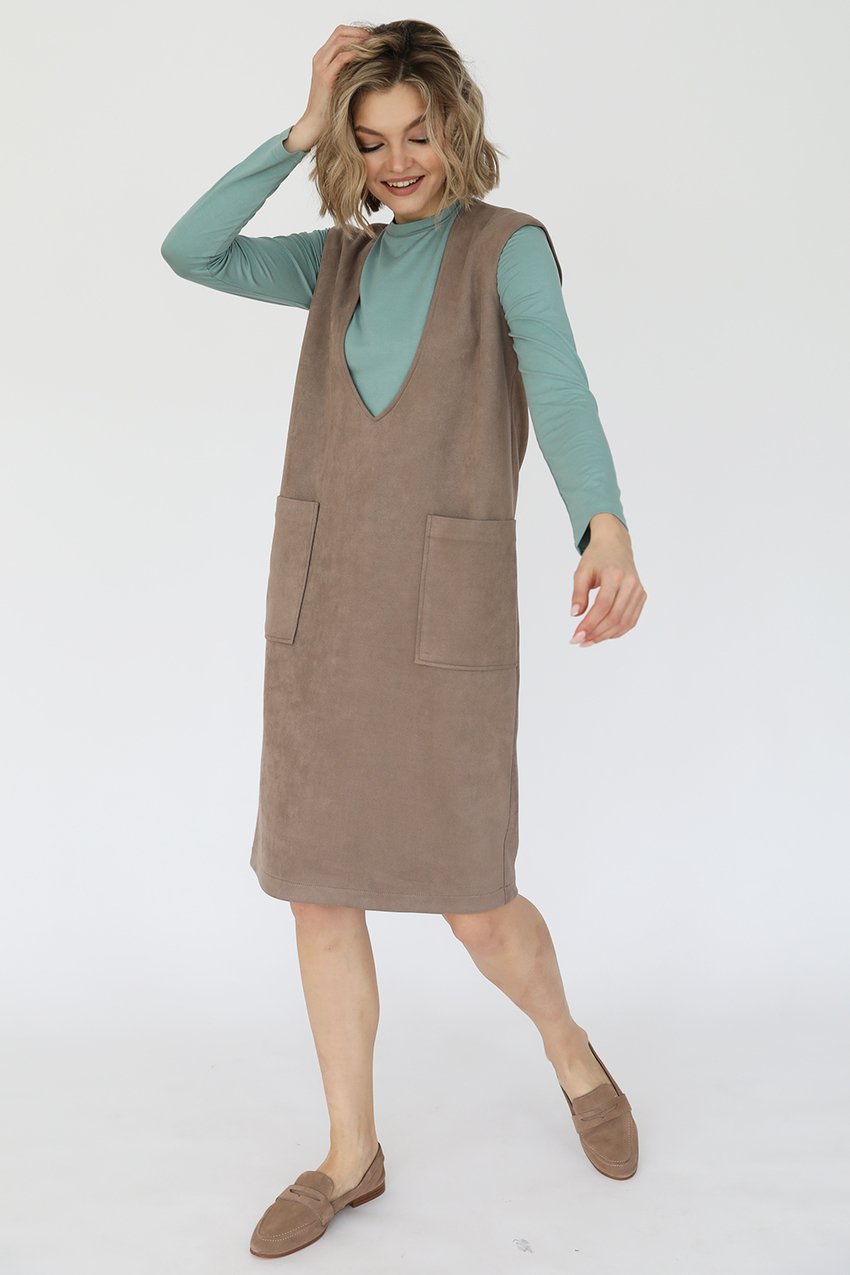 Сарафан из искусственной замши с глубоким V-вырезом горловины и накладными карманами.