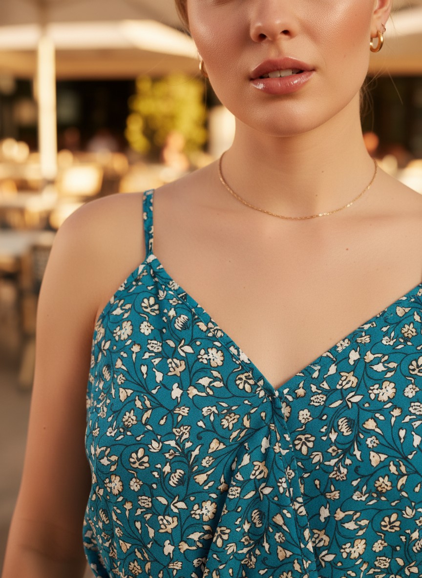 Сарафан молодежный из тканого полотна «штапель» с набивным рисунком, с углубленной V-образной горловиной, на узких бретелях, отрезное по линии талии, с расклешенной юбкой, собранной с помощью эластичной тесьмы. Горловина и проймы окантованы основным материалом. Переднее полотнище юбки из двух частей, в соединительном шве выполнен разрез. Изделие комплектуется съемным поясом, завязывающимся на талии.