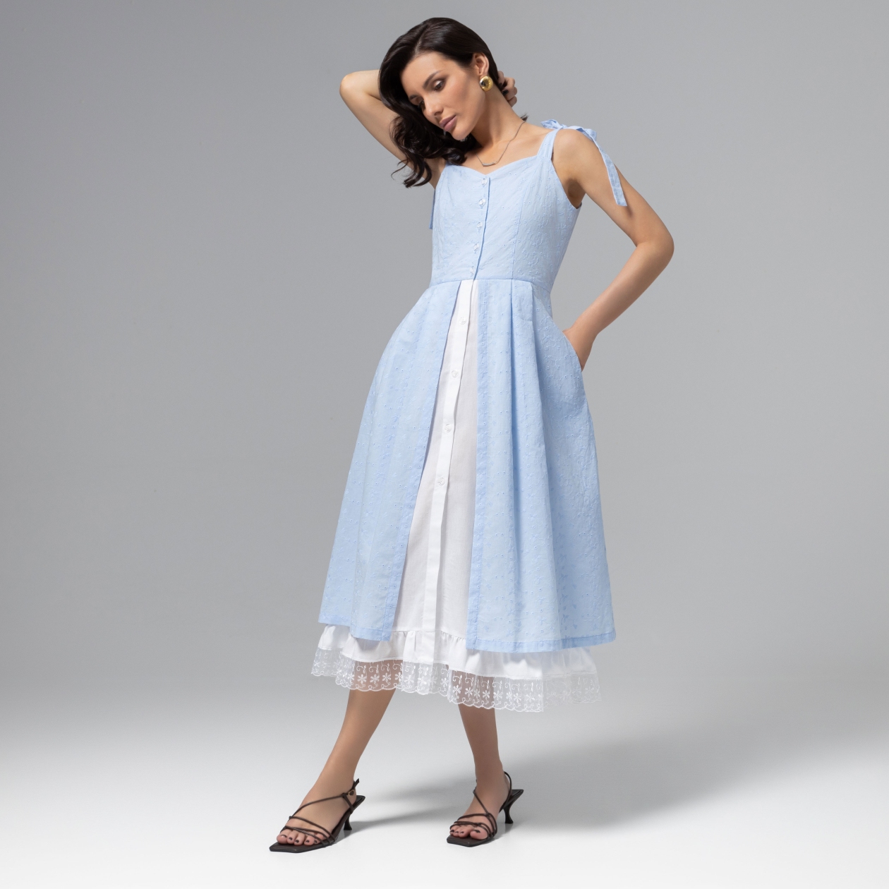 Чувственность, как основа образа. Сарафан из коллекции PREMIUM – возможность сделать look романтичным, модным и многогранным. Носите, как сарафан или стилизуйте как удлиненный топ, расстегнув часть пуговиц. Сарафан приталенного силуэта в длине миди их хлопка. Выверенный крой с имитацией многослойности. Завязки на бретелях позволяют регулировать длину. Изделие с карманами.