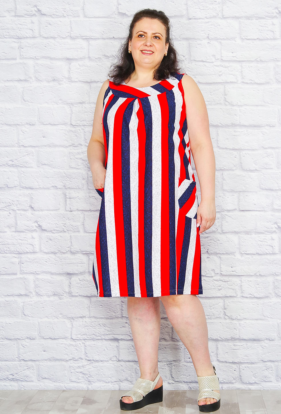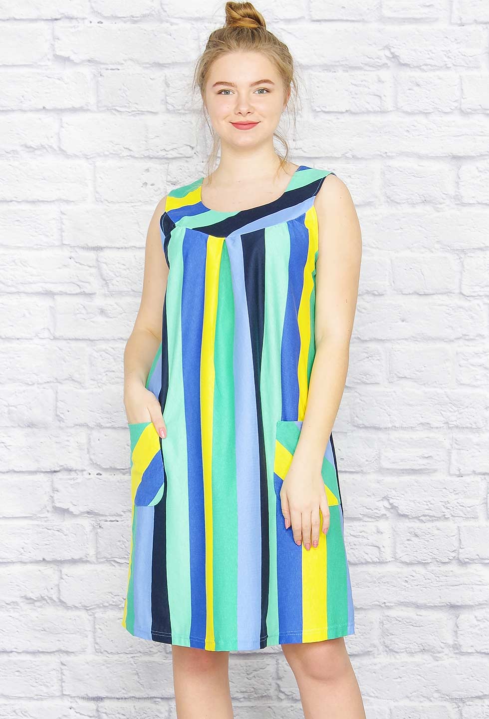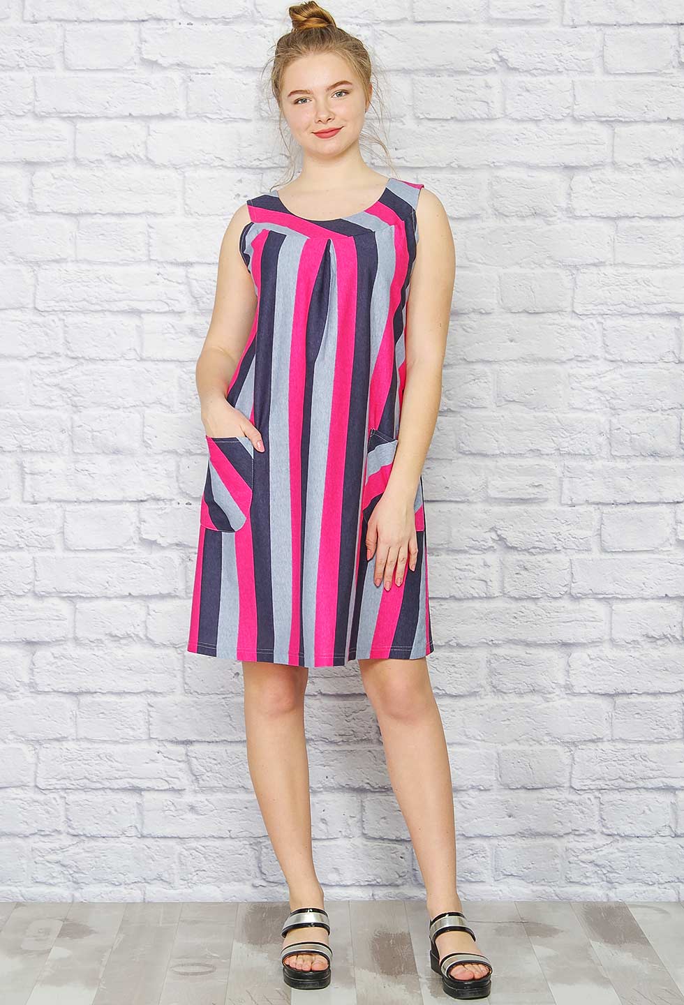 Симпатичный летний сарафан А-силуэта с удобными накладными карманами из качественной кулирки.
