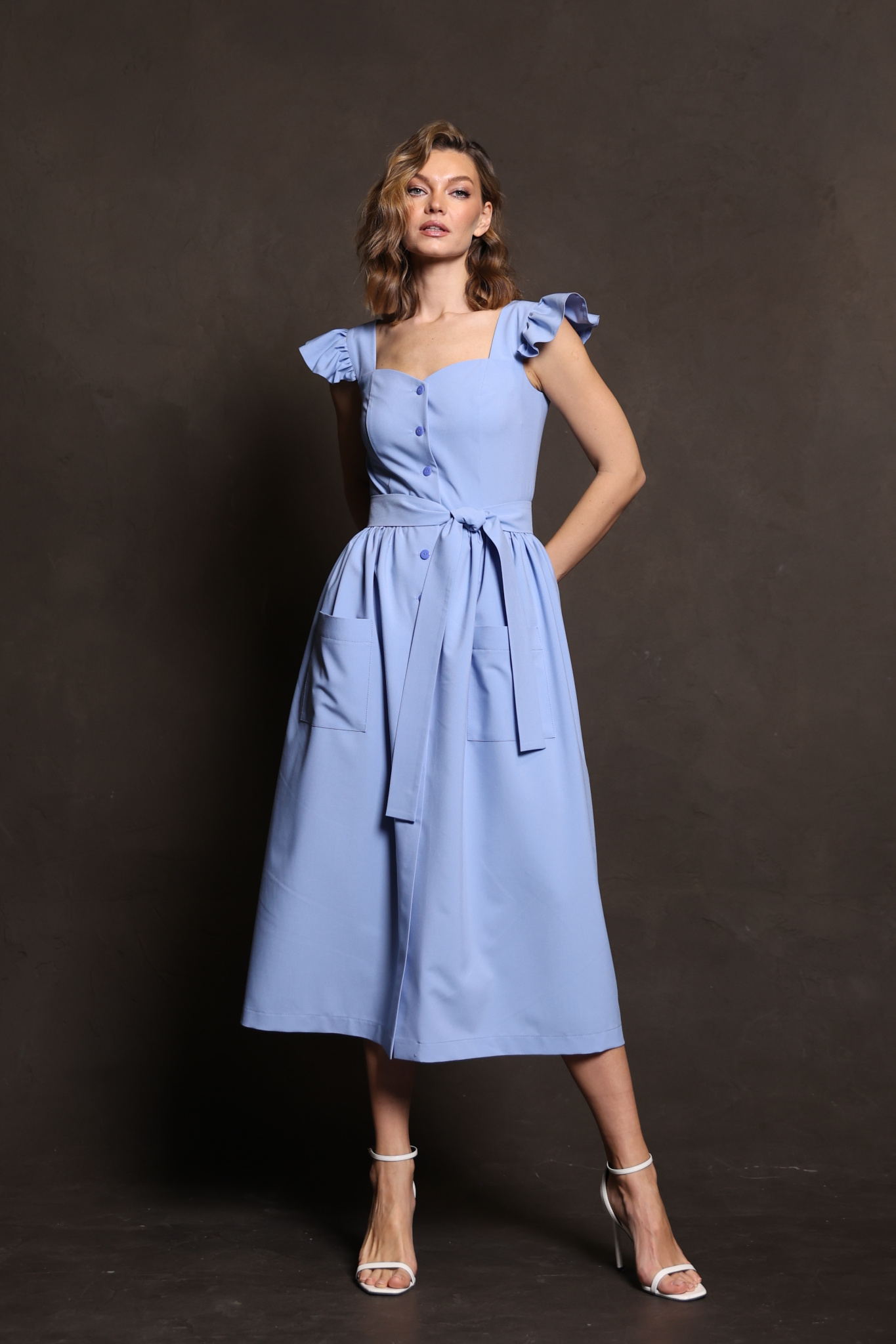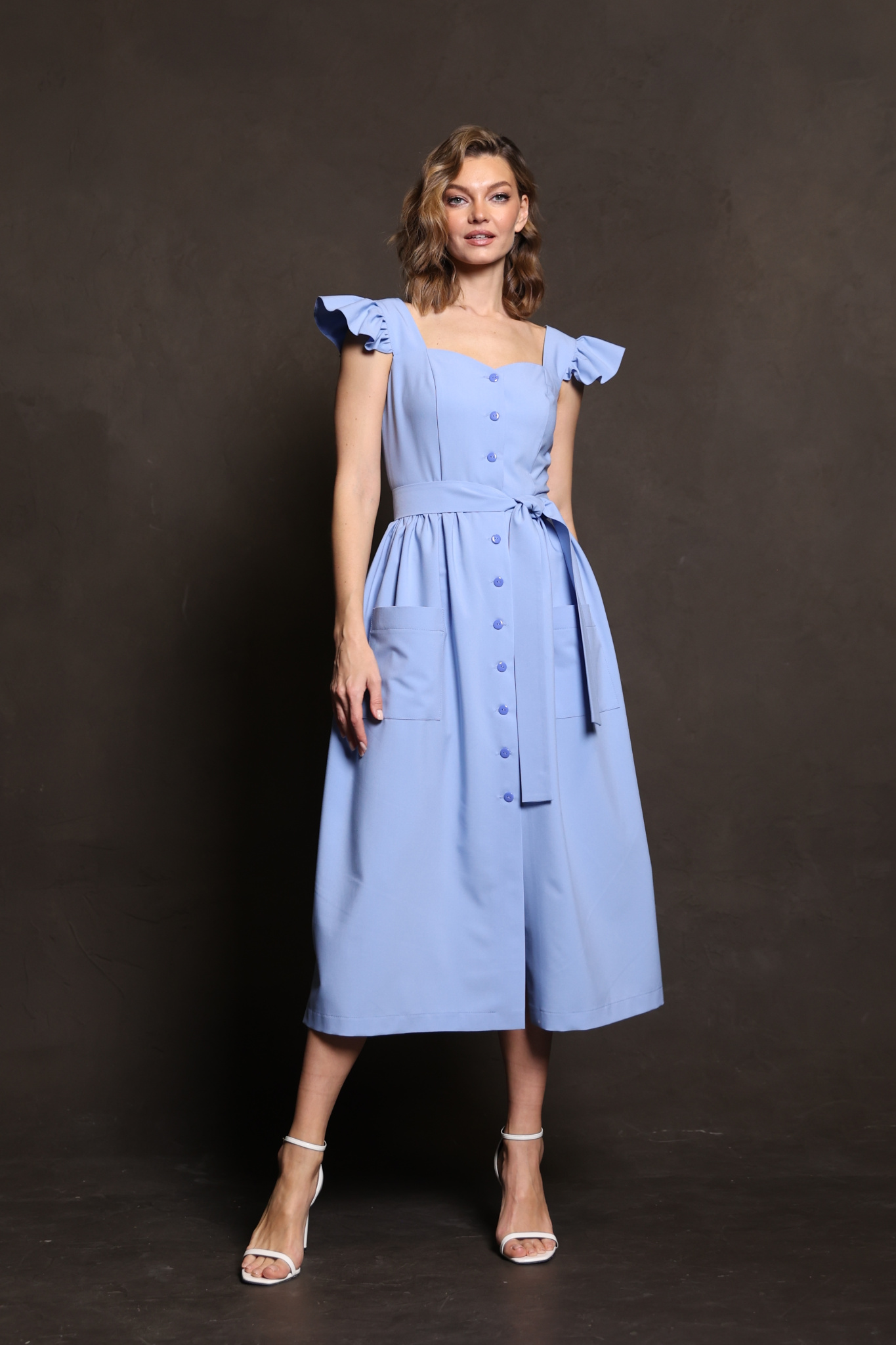Сарафан миди на широких бретелях с крылышками. Отрезной по линии талии со сборкой. Накладные карманы на юбке. Застежка на пуговицы по переду.