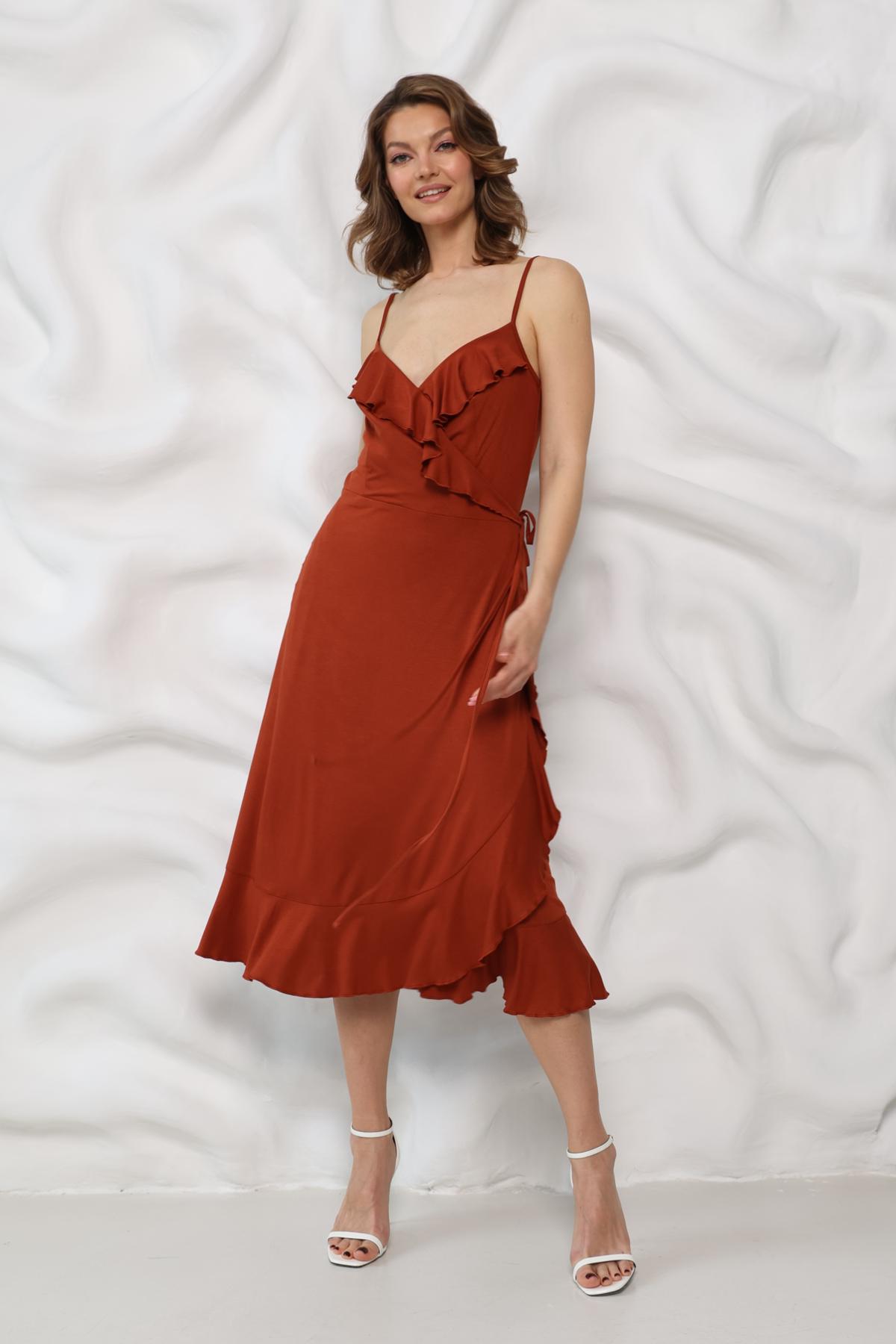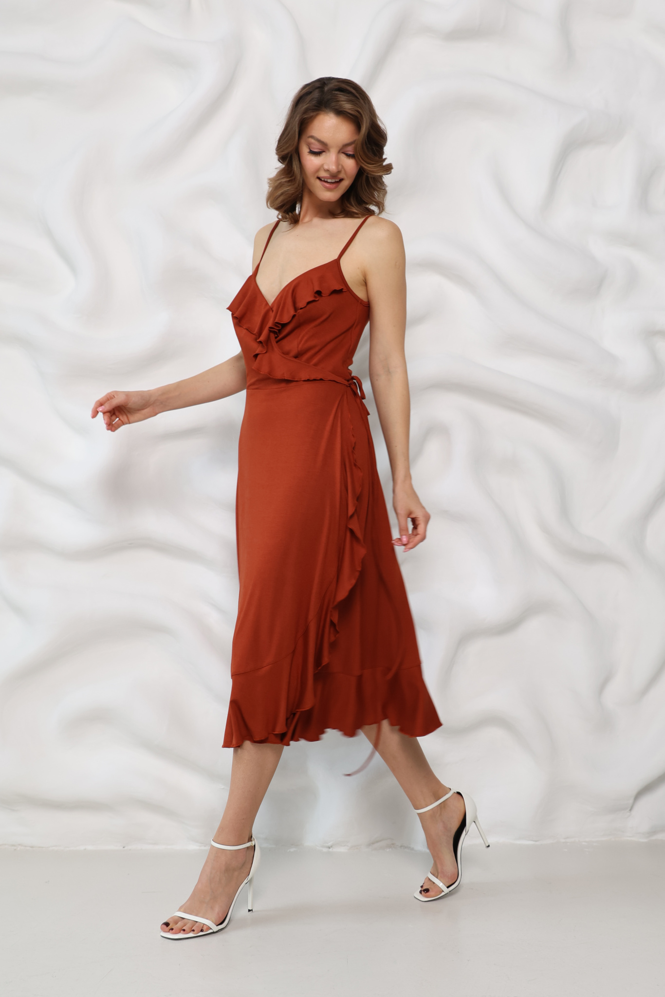 Платье-сарафан из трикотажа на тонких регулируемых бретелях с воланом по лифу платья и с воланом по юбке платья. Сарафан завязывается на талии на тонкий пояс. Длина миди.