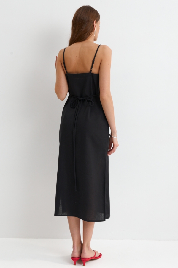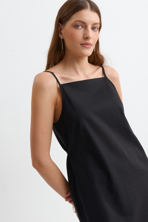 Сарафан базового цвета из льняного полотна. Модель свободного прямого силуэта. Тонкий пояс из основного материала, вшит в боковые швы. Разрезы по бокам. Бретели регулируемые. Пояс можно обернуть вокруг талии и завязать спереди.