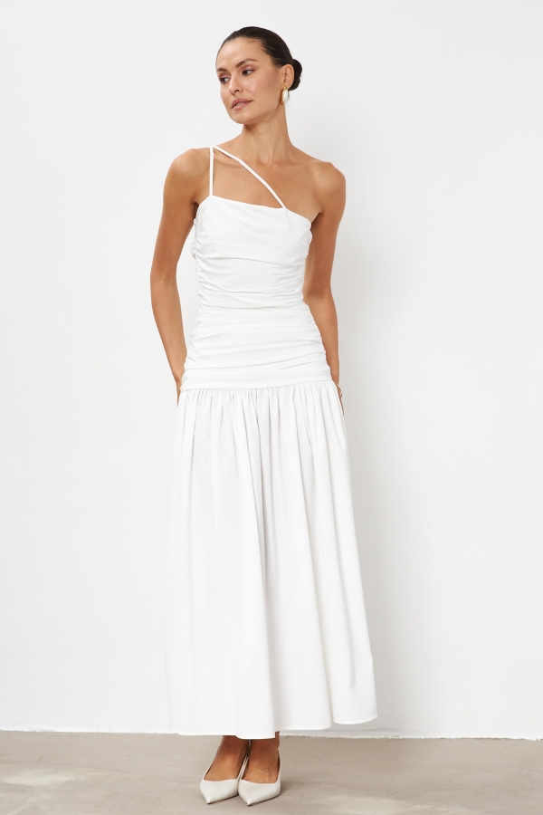Платье длины макси со сборками из вискозы. Модель прилегающего силуэта, с заниженной линией талии. По боковым швам декоративные сборки. По спинке застежка на молнию.