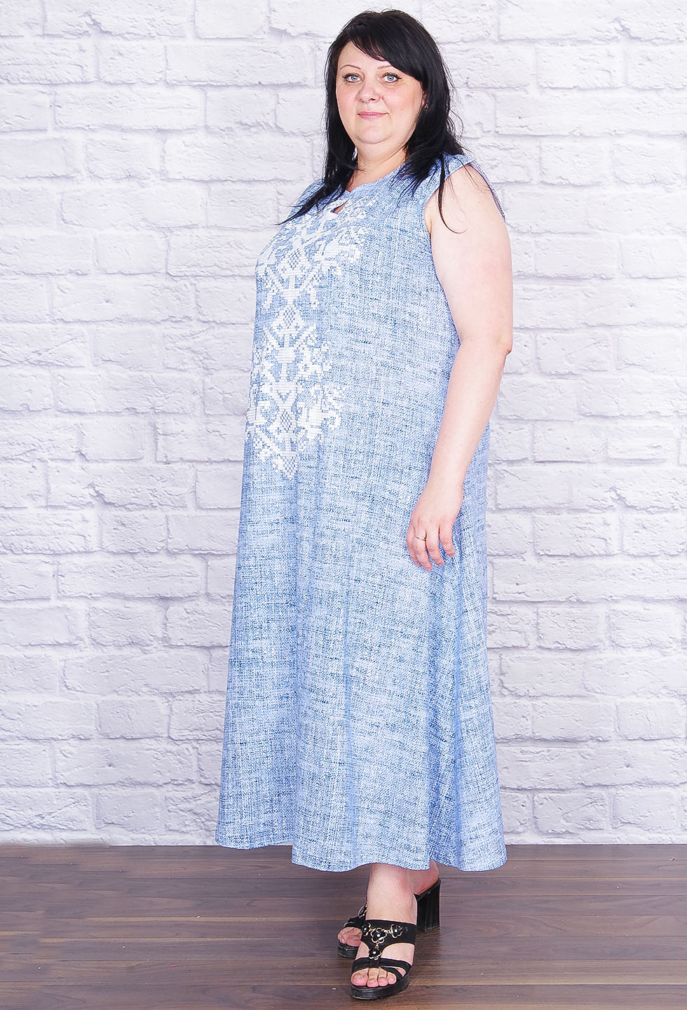 Лёгкий хлопковый сарафан свободного, расклешёного к низу фасона, с боковыми карманами. Интересное оформление горловины с фигурным вырезом придаёт образу романтичности и нежности. Эффектно смотрится орнамент на полочке. Рост модели 165 см.