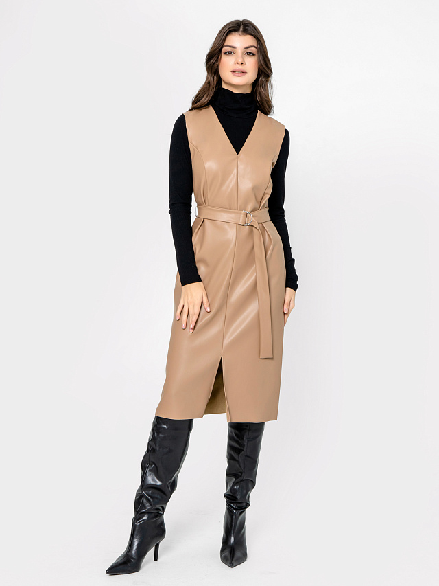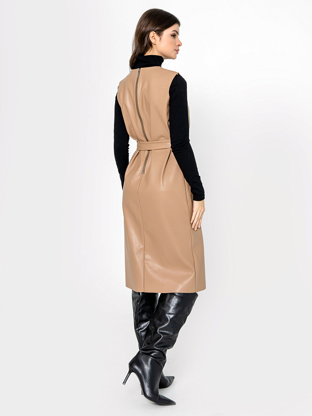 Очаровательный сарафан женский из полотна под кожу — идеальный выбор для тех, кто любит стильные вещи и дизайнерские решения. Платье имеет полуприлегающий силуэт, который помогает подчеркнуть фигуру и создает чувство комфорта. Горловина V-образной формы делает эту модель еще более изысканной и привлекательной. Деталь переда с рельефами и центральным швом — интересное дизайнерское решение, которое добавляет изюминку этому сарафану. Низ платья с центральным передним швом, в котором обработан разрез, максимально удобен и практичен в использовании. Это позволяет комфортно двигаться в течение дня. Спинка с центральным швом и застежка на металлическую молнию добавят этому сарафану еще больше элегантности, а пояс из основного полотна с металлическими полукольцами подчеркнет талию. Длина - чуть ниже колена. Рекомендуем на осень, зиму и демисезон!