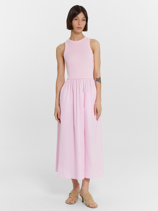Этот женский сарафан прилегающего силуэта сочетает элегантность и комфорт. Верхняя часть выполнена из рибаны, что обеспечивает мягкость и эластичность, позволяя изделию комфортно облегать фигуру. Круглая горловина придает классический и универсальный вид, а присборенная нижняя часть создает легкость и женственность. Шов по талии с эластичной тесьмой внутри обеспечивает удобную посадку и подчеркивает силуэт. Расширяющийся книзу крой делает сарафан воздушным и свободным, а длина миди подходит для различных случаев — от повседневных прогулок до более нарядных образов.