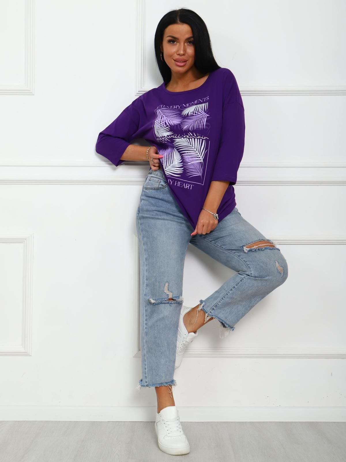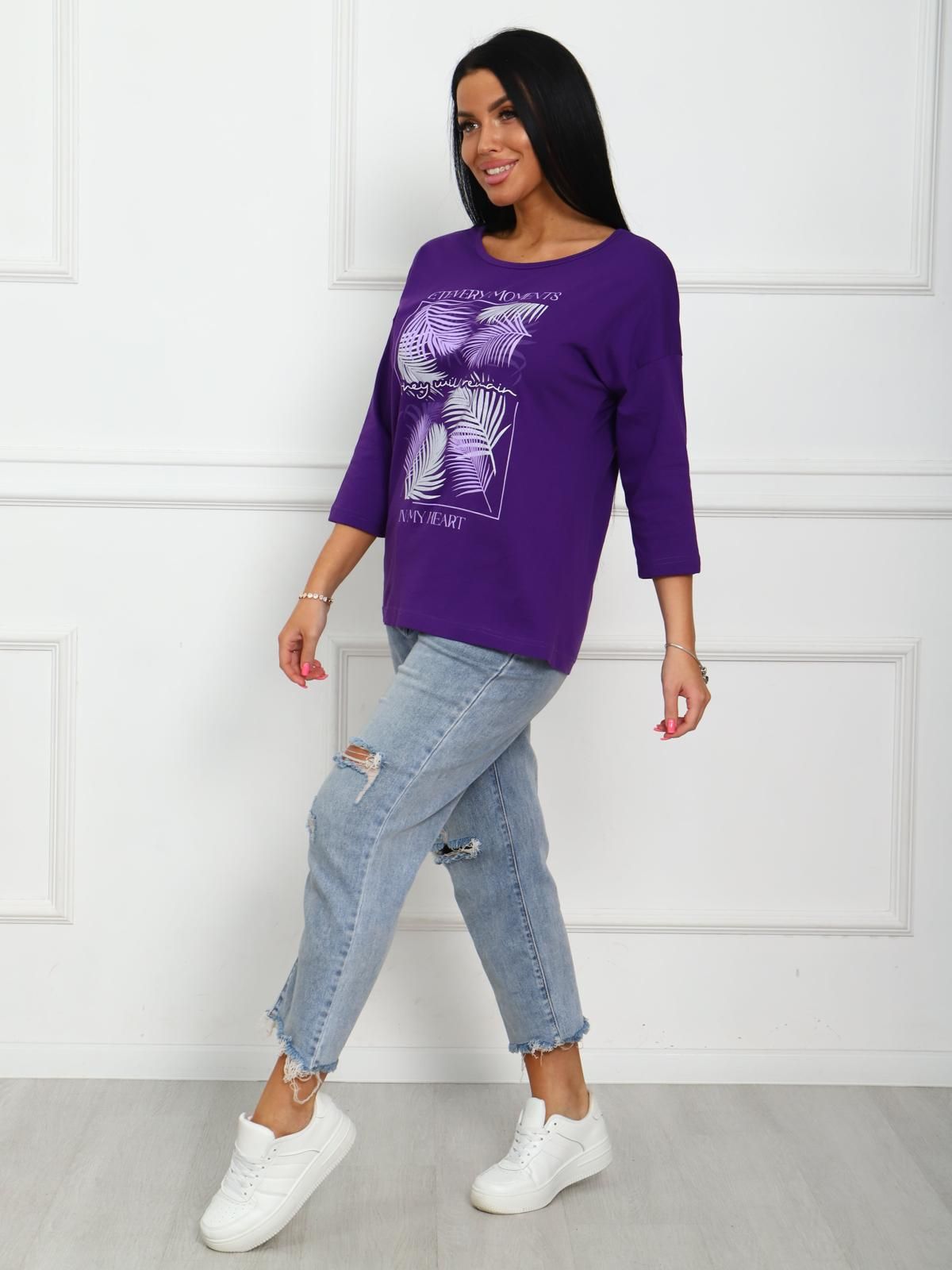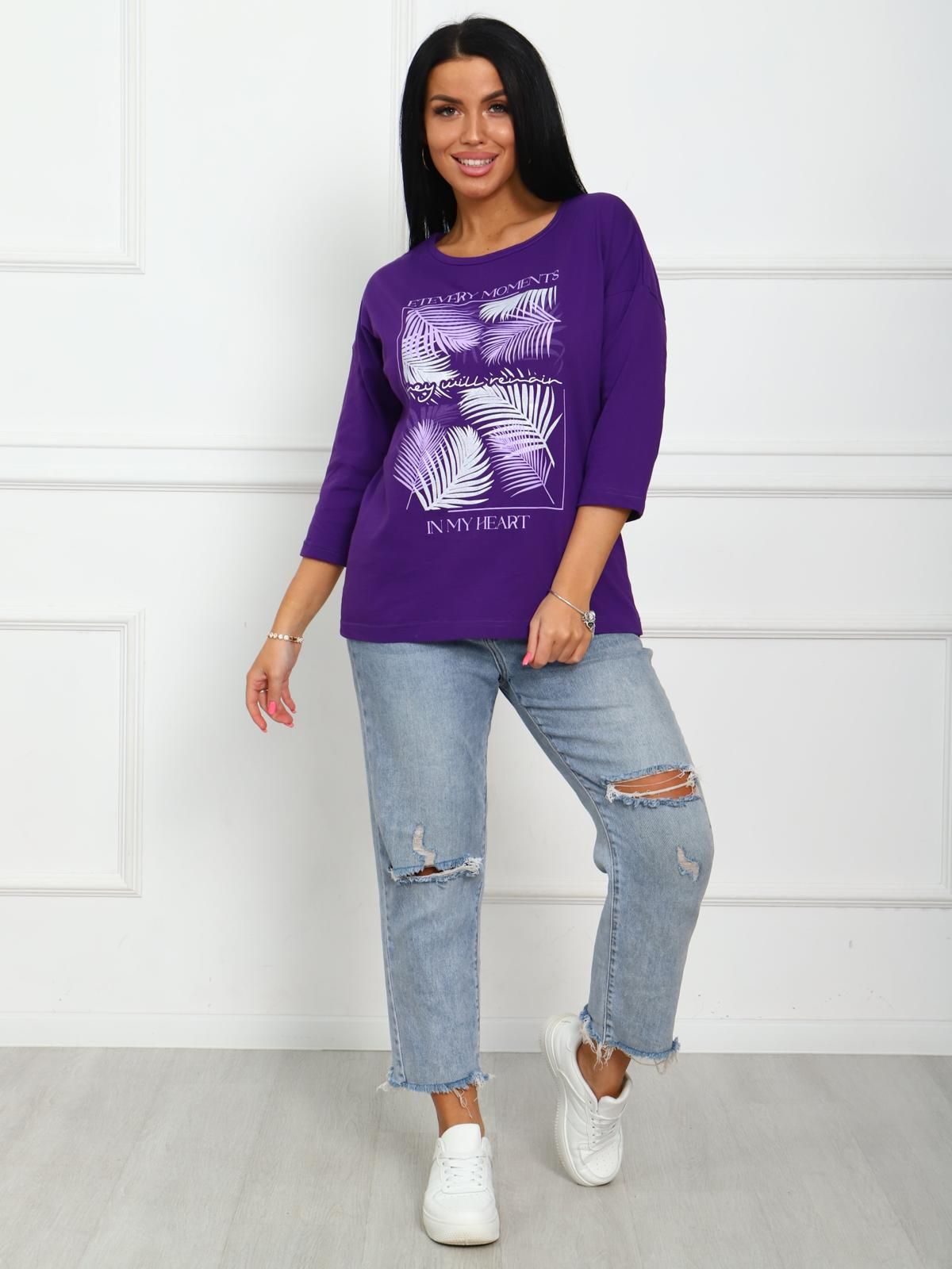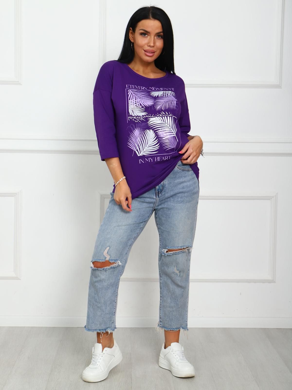 Футболка женская с растительным принтом, из натурального трикотажа. Отличный вариант одежды, который позволяет скрыть все недостатки фигуры и подчеркнуть достоинства. Мягкие линии  делают эту модель очень женственной. Горловина круглой формы. Полуприлегающий силуэт, рукав три четверти.  Принт нанесен непосредственно в ткань футболки - не наклейка.