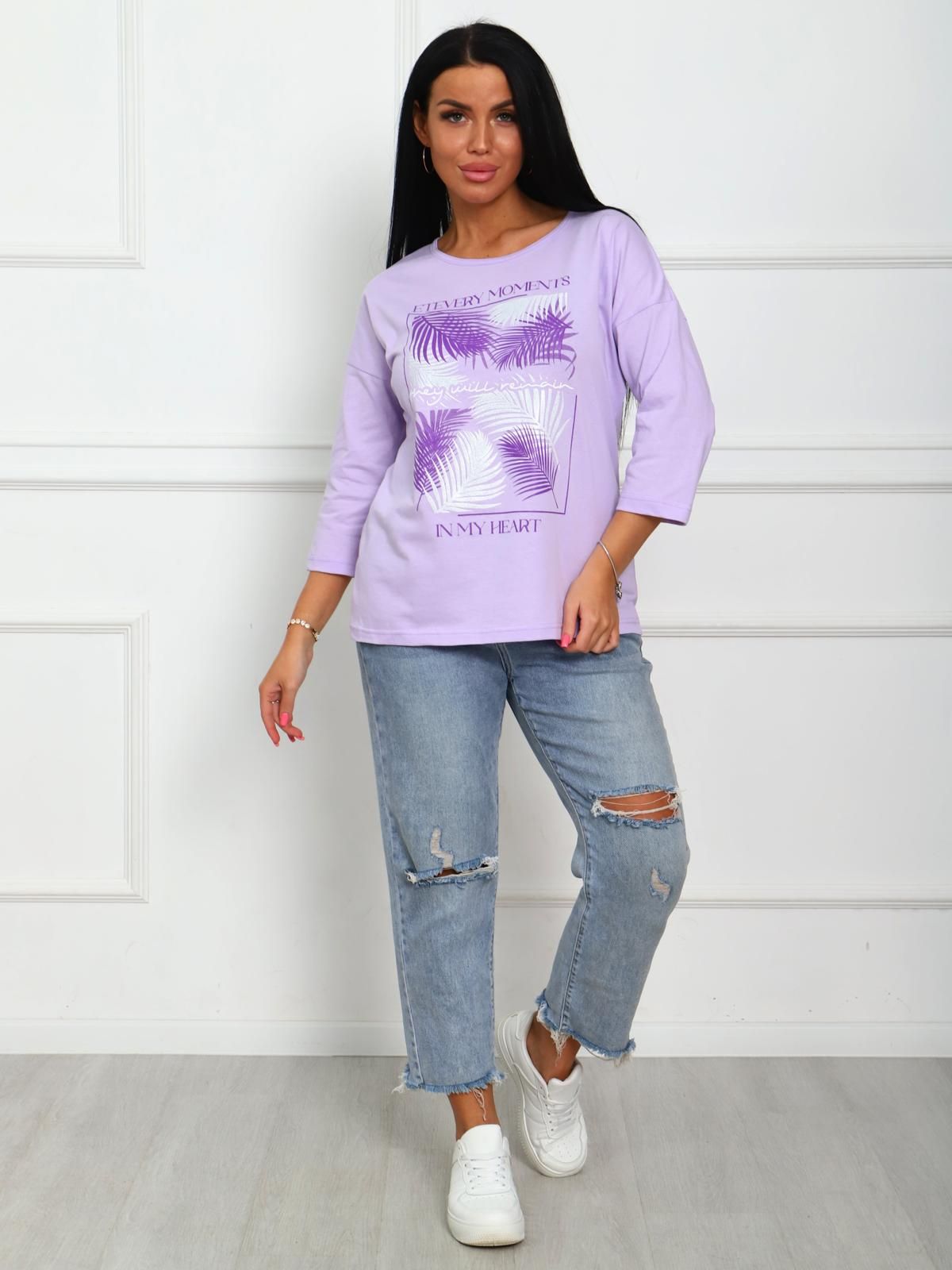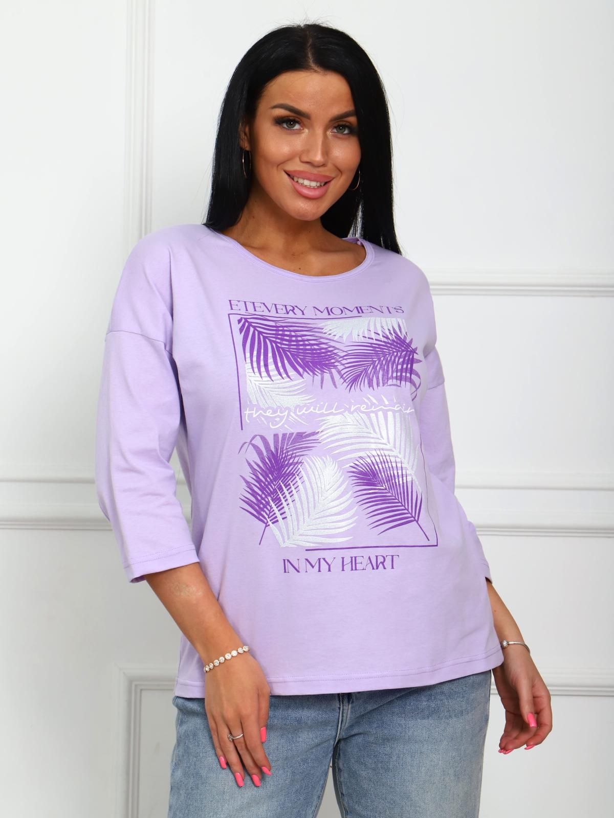 Футболка женская с растительным принтом, из натурального трикотажа. Отличный вариант одежды, который позволяет скрыть все недостатки фигуры и подчеркнуть достоинства. Мягкие линии  делают эту модель очень женственной. Горловина круглой формы. Полуприлегающий силуэт, рукав три четверти.  Принт нанесен непосредственно в ткань футболки - не наклейка.