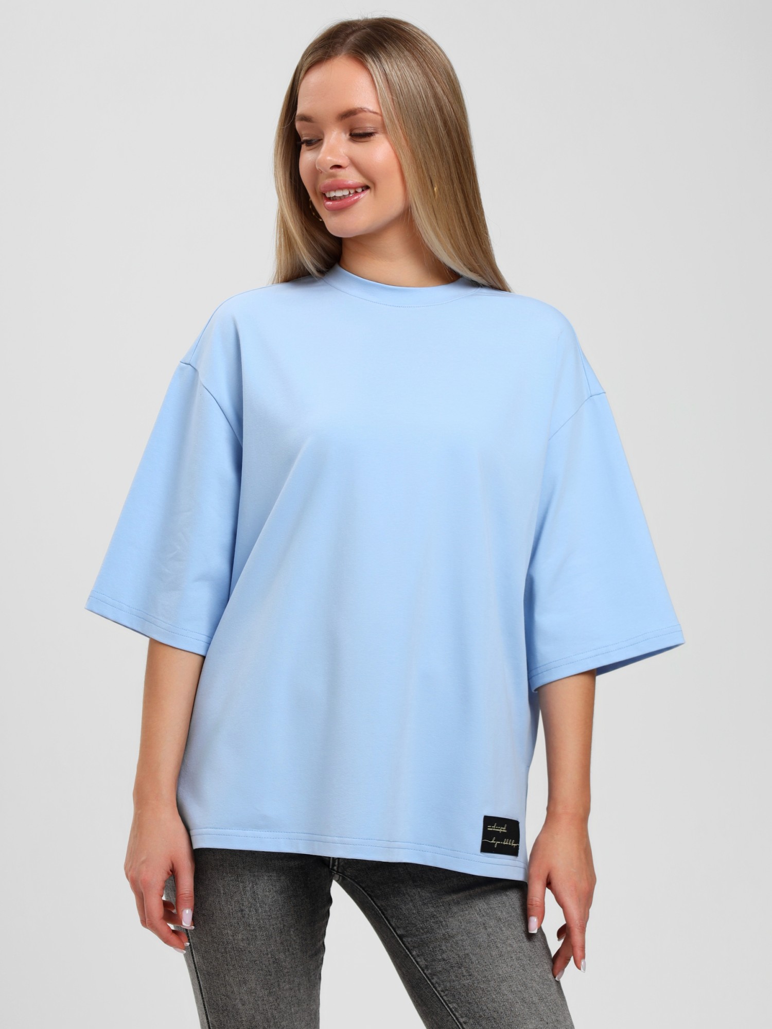 Футболка молодежная из гладкокрашенного полотна «кулирка с лайкрой», свободного покроя, со спущенной линией плеча, втачными рукавами длиной до локтя, горловиной овальной формы, обработанной втачной планкой. Изделие дополнено декоративной нашивкой, в боковых швах выполнены разрезы.