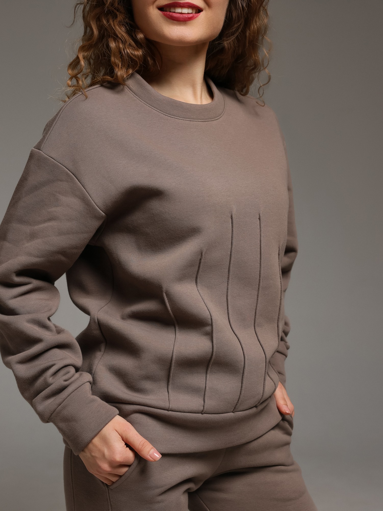Костюм молодежный из гладкокрашеного трикотажного полотна «футер- трехнитка», состоящий из джемпера и брюк овальной формы, обработанной втачной планкой и притачным поясом по низу. Рукава – с притачными манжетами. Манжеты, планка горловины и пояс выполнены из полотна «кашкорсе» такого же цвета, как и основной материал. На полочке застрочены декоративные складочки-защипы, расположенные симметрично относительно линии центра. Брюки – длинные, на притачном поясе с эластичной тесьмой внутри и манжетами по низу. Передние половины – из двух частей каждая, со смещением соединтельных швов в сторону боковых срезов. Соединительные швы передних половин обработаны с карманами. Пояс и манжеты выполнены из трикотажного полотна «кашкорсе».