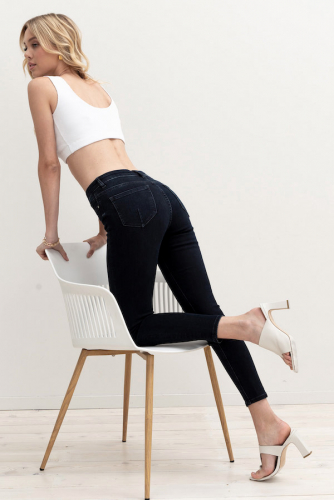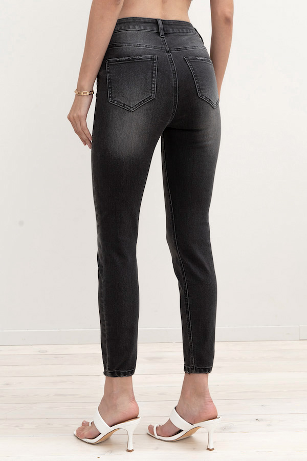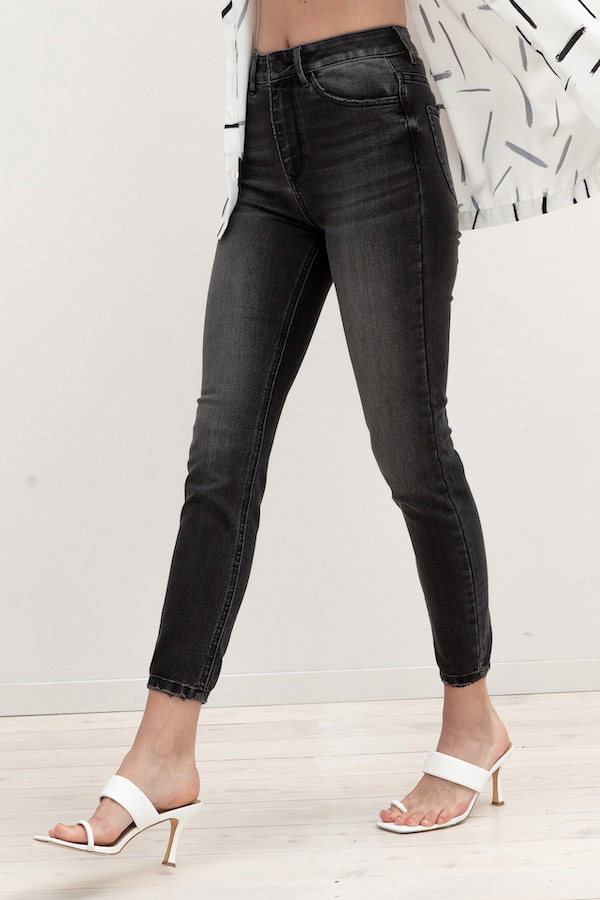 Брюки из эластичного денима, зауженные книзу выполнены по классической джинсовой технологии (варка с эффектом легкого выбеливания). На задней части брюк выполнены накладные карманы, на передней - карманы с подкройным бочком. Притачной пояс со шлёвками. Застёжка на молнию-гульфик и пуговицу.