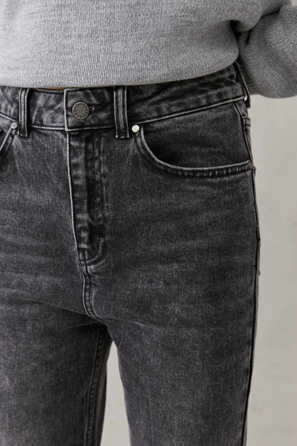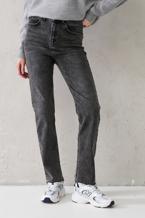 Брюки из эластичного денима выполнены по классической джинсовой технологии (варка с эффектом легкого выбеливания). Прямой классический крой. На задней части брюк выполнены накладные карманы, на передней - карманы с подкройным бочком. Притачной пояс со шлёвками. Застёжка на молнию-гульфик и пуговицу. По внутренней части брюк разрезы. Низ изделия имеет стильный необработанный край.