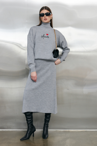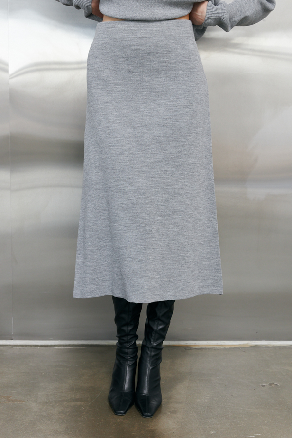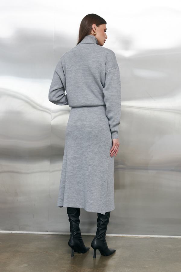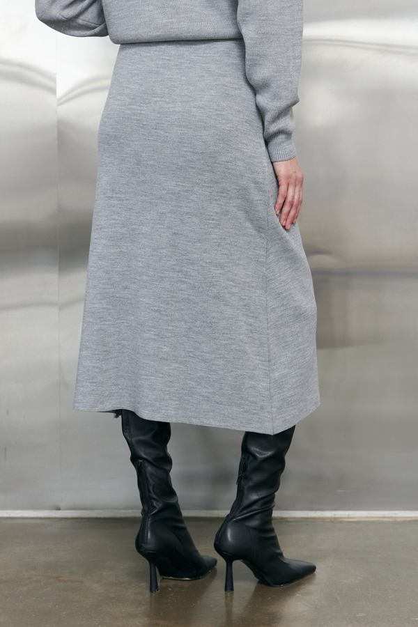 Юбка, расширенная книзу с эластичным поясом. Изделие выполнено из меланжевой пряжи.