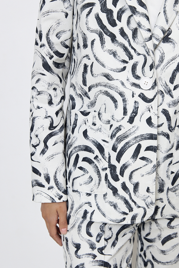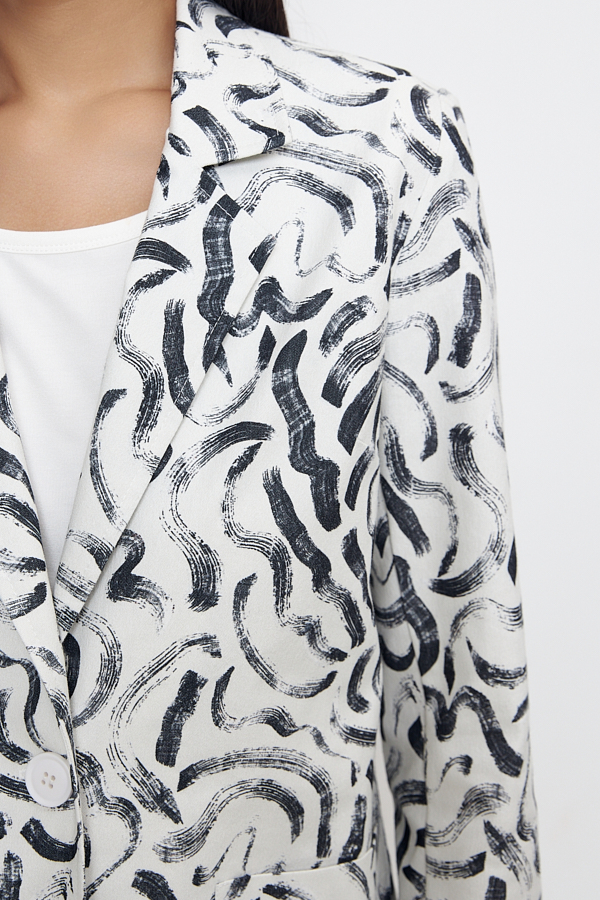 Жакет прямого силуэта с английским воротником из хлопковой ткани. На передней части жакета застежка на пуговицу и накладные карманы. Втачной длинный рукав. Изделие имеет четкую линию плеча благодаря плечевым накладкам.