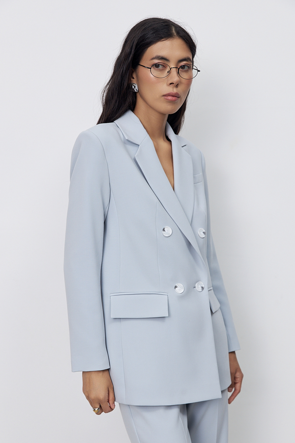 Двубортный жакет из костюмной ткани. Изделие полуприлегающего силуэта с английским воротником и застежкой на пуговицы. На передней части жакета выполнен нагрудный карман с листочкой и карманы в рамку с клапаном. По центру задней части выполнена шлица - элемент декоративный и необходимый. Обеспечивает свободу движения, добавляет шику и элегантности. Втачной длинный рукав, снизу имитация шлицы с пуговицами. Изделие идеально держит форму, имеет четкую линию плеча благодаря плечевым накладкам. Жакет на подкладке.